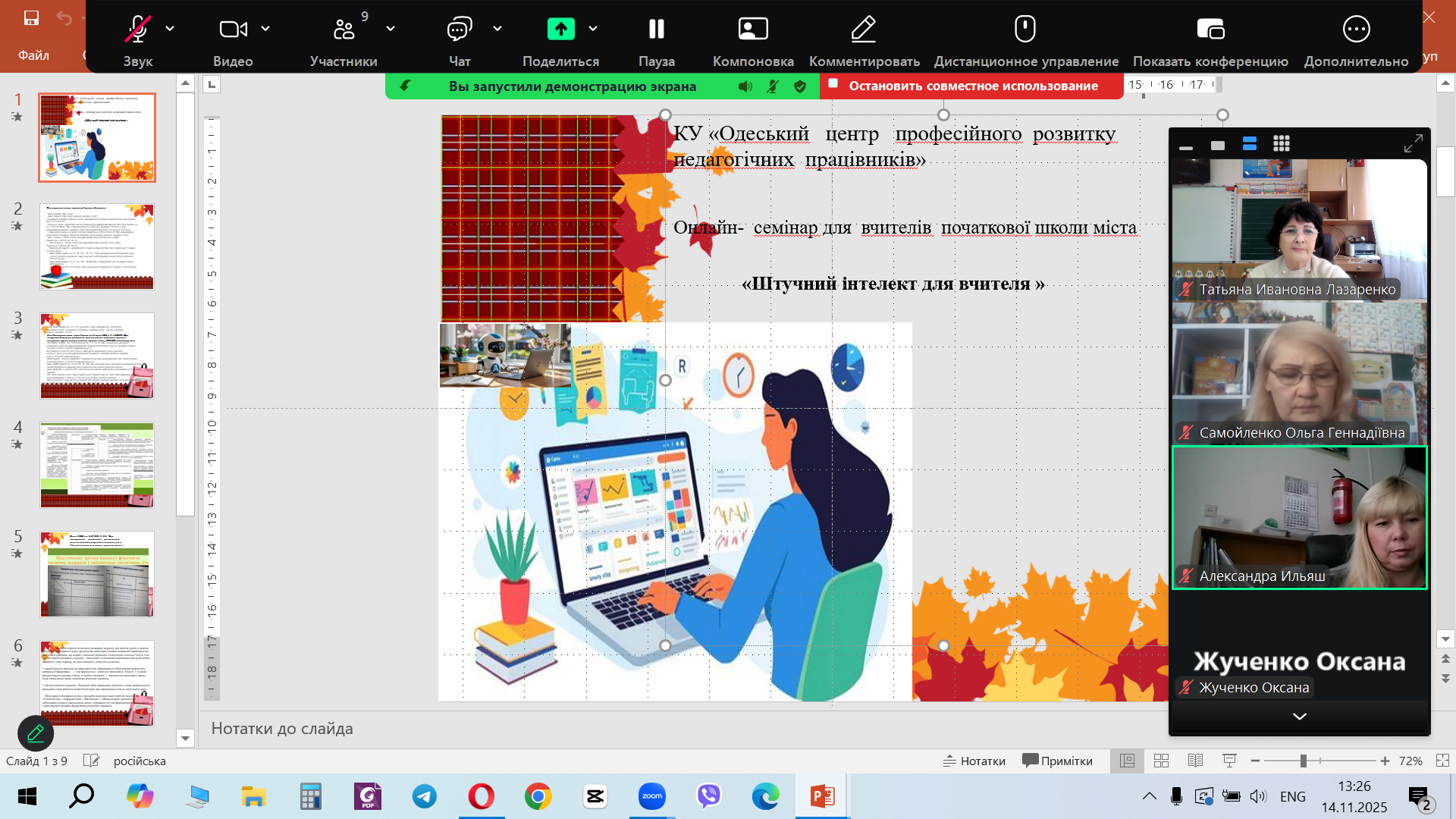 14 листопада 2025 року Комунальною установою «Одеський центр професійного розвитку педагогічних працівників» проведений онлайн- семінар на тему «Штучний інтелект для вчителя». Захід, орієнтований на вчителів початкової школи міста Одеси, дав змогу дізнатися як штучний інтелект може стати справжнім помічником у професійній діяльності.