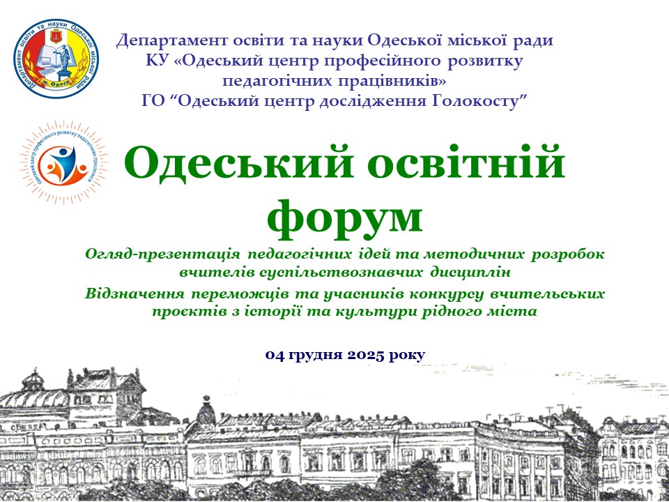 В рамках Меморандуму про співпрацю Департаменту освіти та науки Одеської міської ради з ГО «Одеський центр дослідження Голокосту», Комунальна установа «Одеський центр професійної розвитку педагогічних працівників» розпочинає новий проєкт «Одеський освітній форум». Мета: виявлення та поширення ефективного досвіду роботи з викладання предметів громадянської та історичної освітньої галузі.