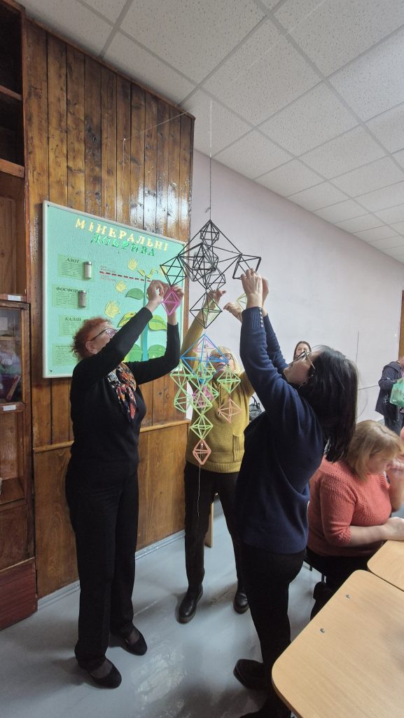 Вчителі разом з модераторкою семінару, консультантом Коиунальної установи «Одеський центр професійного розвитку педагогічних працівників» Оленою ДРАГАНОВОЮ, не лише опанували техніку складання об’ємної геометричної конструкції павука, а й обмінялися досвідом щодо впровадження елементів української етнографії та народного мистецтва в сучасні уроки трудового навчання та технологій.