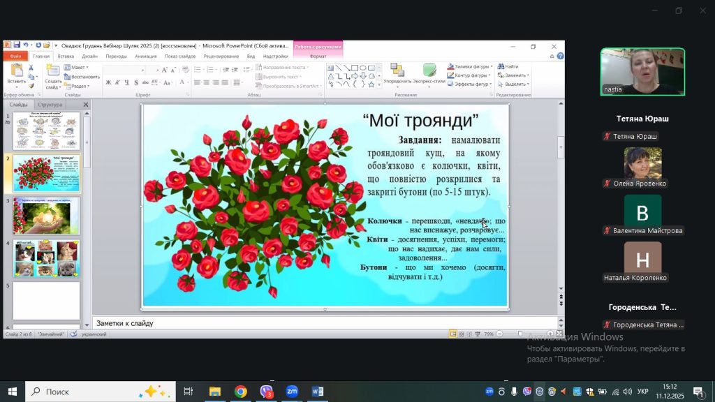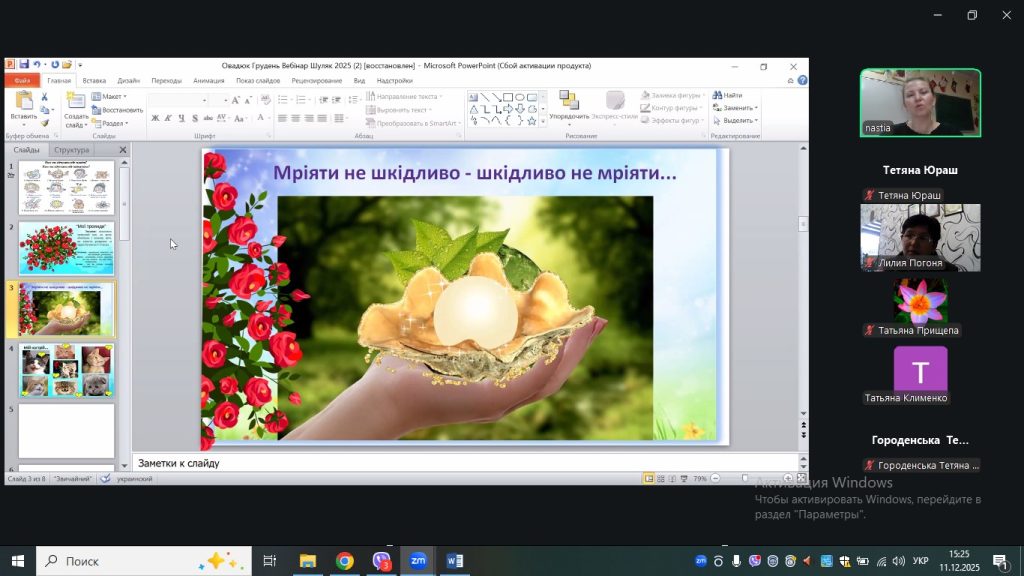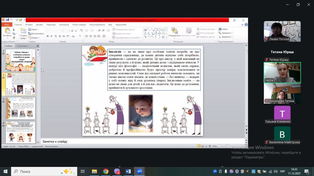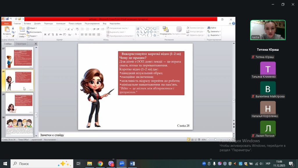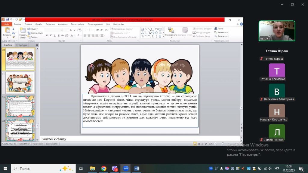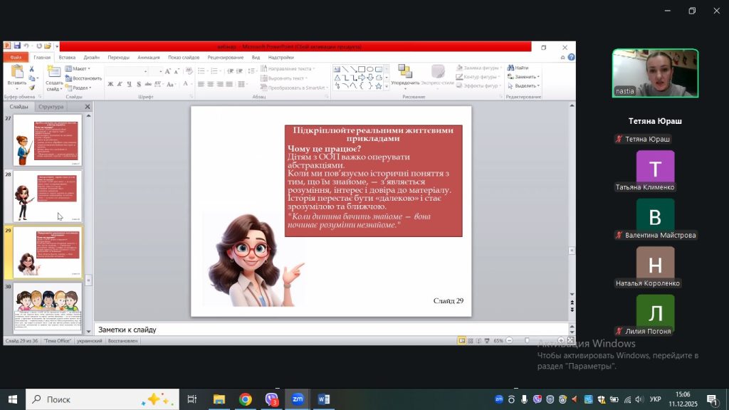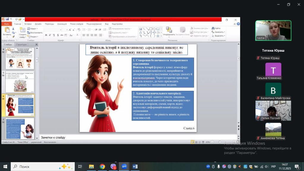 11 грудня 2025 року на платформі Zoom відбувся вебінар для вчителів історії та асистентів вчителів міста Одеси «Робота з дітьми з особливими освітніми потребами на уроках історії. Практичні поради».