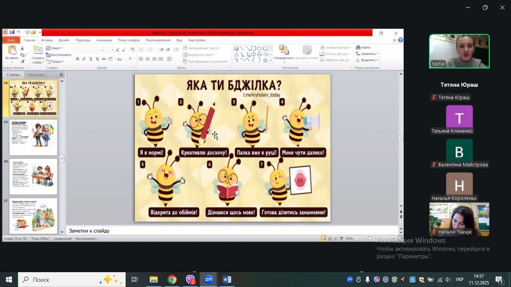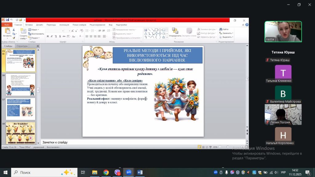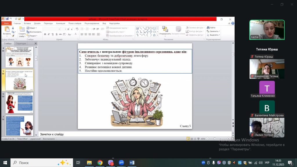 У ході виступу Анастасії Олександрівни було визначено роль педагога у впровадженні інклюзивної освіти. Мова йшла про те, що саме вчитель є рушійною силою в реалізації інклюзивного навчання, адже він безпосередньо організовує освітній процес, створює сприятливе середовище для кожної дитини та забезпечує рівний доступ до знань, застосовує диференційовані та інклюзивні методики навчання, створює умови для активної участі кожної дитини в навчальному процесі.