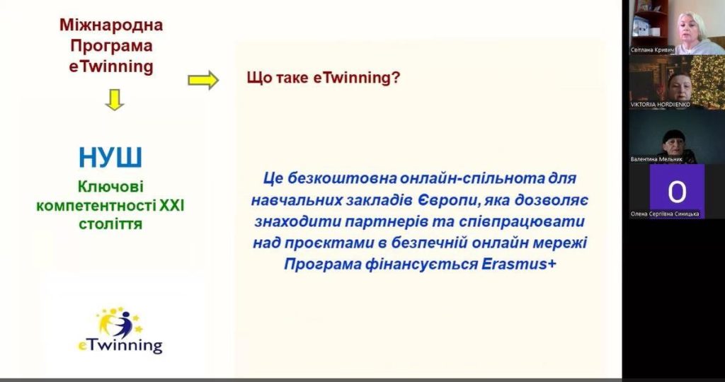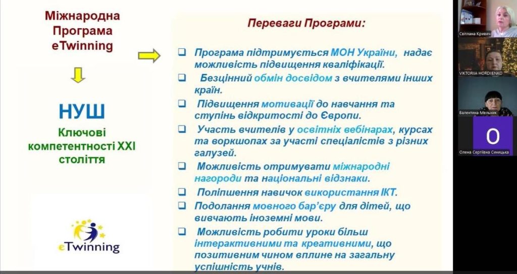 Під час вебінару консультантка Одеського центру професійного розвитку педагогічних працівників Світлана Кривич окреслила цінність та ключові напрямки освітньої програми eTwinning, яка об’єднує педагогів із 46 країн Європи і світу на єдиній міжнародній платформі для обміну сучасним досвідом; звернула увагу на ключові аспекти Професійного стандарту вчителя, в якому одне із важливих місць посідає інформаційно-комунікаційна компетентність педагогів і здобувачів освіти. Наголошено на швидких змінах цифрового світу й нових вимогах до сучасного вчителя: бути не тільки впевненим користувачем ПК, а створювати й модифікувати цифрові освітні ресурси.