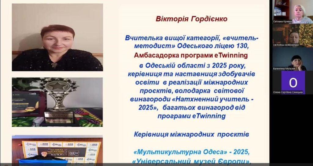 Інтерактивне навчання відбулось у межах проєкту для вчителів англійської мови за темою «Цифровий арсенал сучасного вчителя англійської мови на міжнародній платформі: тематичні освітні міні-проєкти», запровадженого Одеським центром професійного розвитку педагогічних працівників разом з Національним офісом підтримки міжнародної програми eTwinning Україна. Тренерка серії інтерактивних воркшопів з цифрової грамотності – Вікторія Грордієнко, вчителька англійської і німецької мов вищої категорії, «вчитель-методист» Одеського ліцею №13 0; наставниця здобувачів освіти в реалізації міжнародних проєктів,володарка Національної нагороди «Натхненний учитель – 2025» та багатьох інших нагород, амбасадорка програми eTwinning в Одеській області.