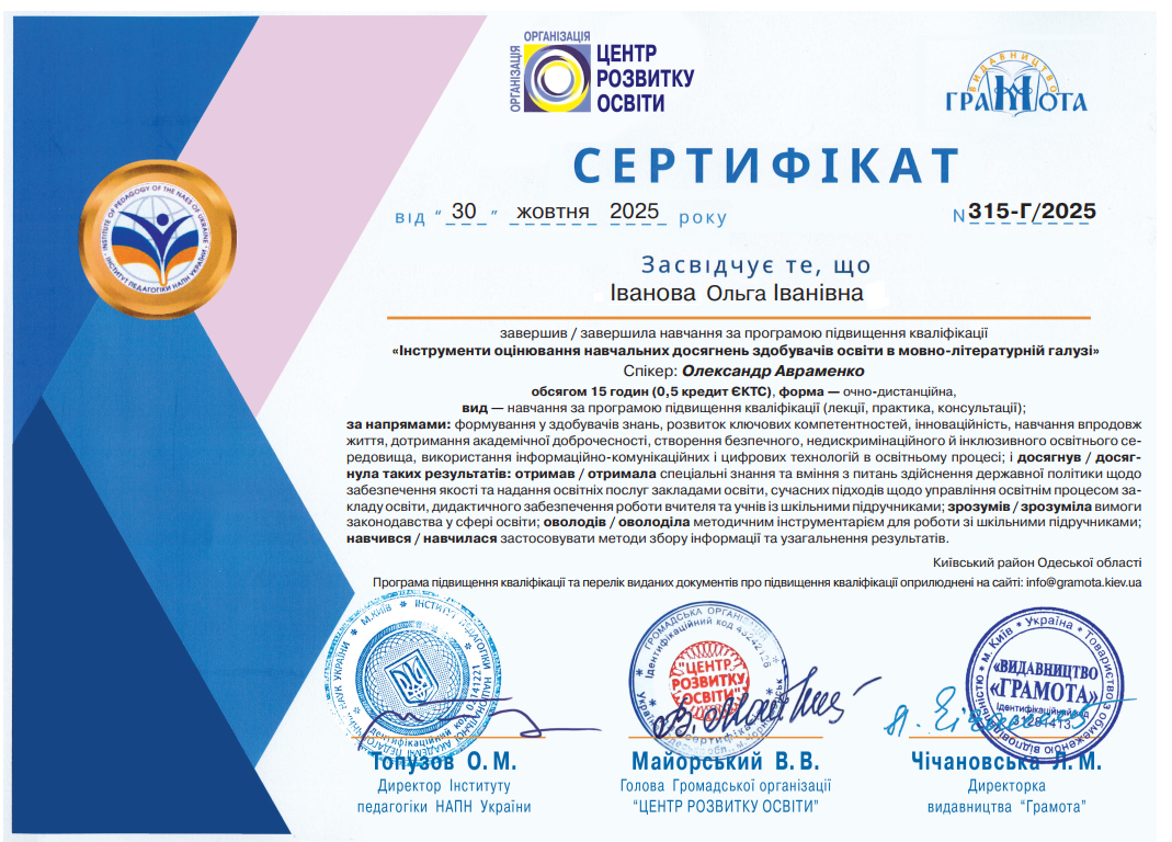 У перші дні нового року за результатами вебінару усі учасники отримали сертифікати Інституту педагогіки НАПН України, ГО «Центр розвитку освіти», видавництва «Грамота» про підвищення кваліфікації, які засвідчують про спеціальні знання та вміння з питань здійснення державної політики щодо забезпечення якості та надання освітніх послуг, формування у здобувачів знань, розвитку ключових компетентностей, навчання впродовж життя.