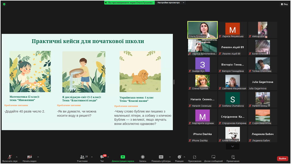 Організаторки заходу продемонстрували приклади проблемного, проєктного та ігрового навчання, а також самостійної роботи учнів, обговорили способи підтримки внутрішньої мотивації та розвитку критичного мислення.