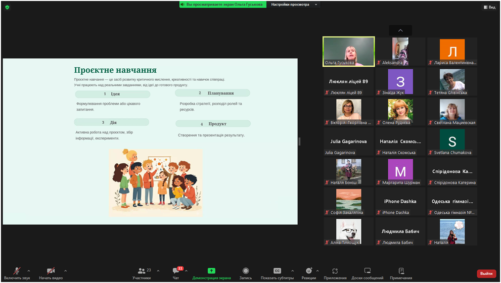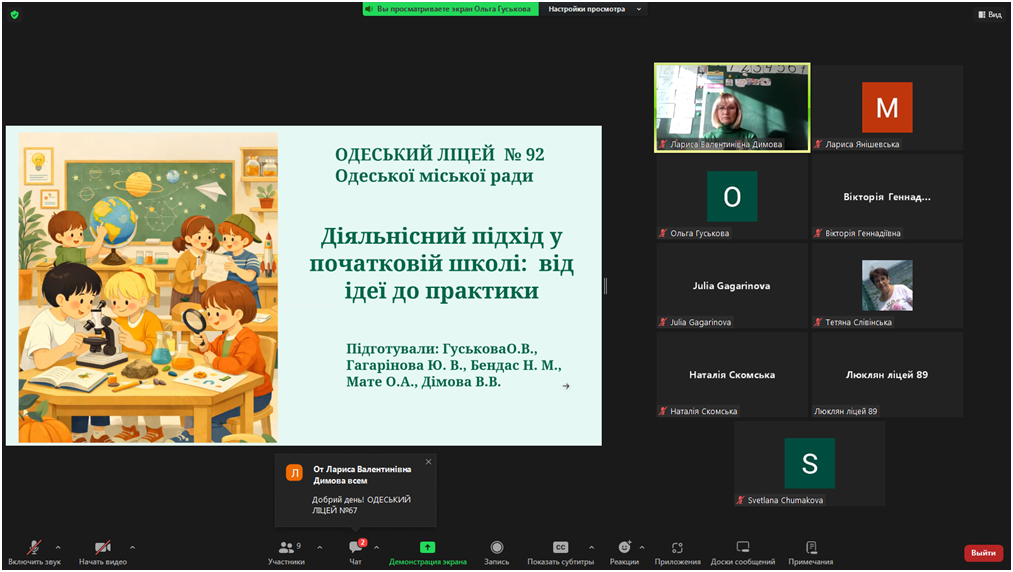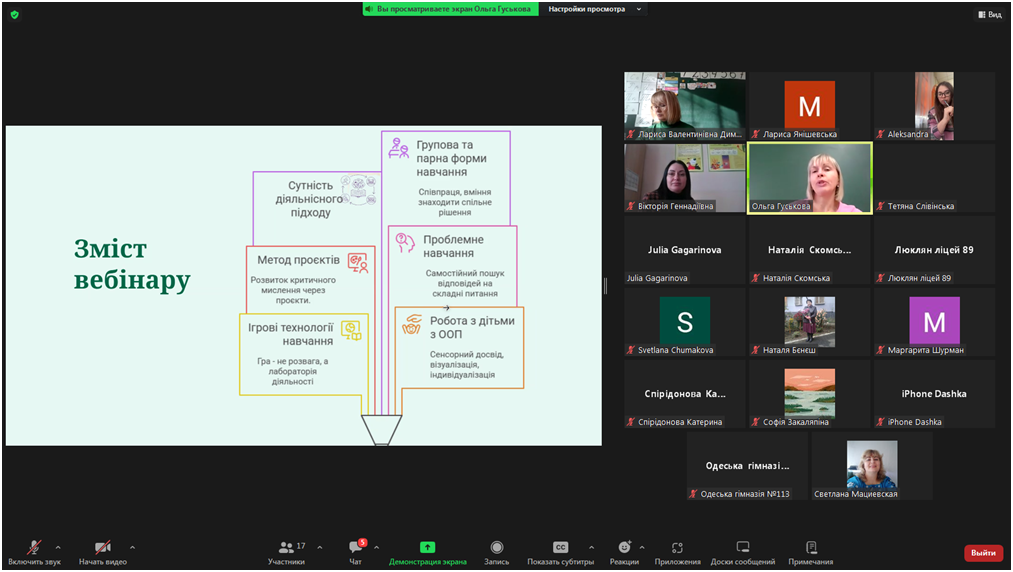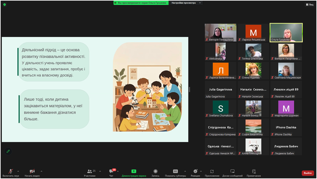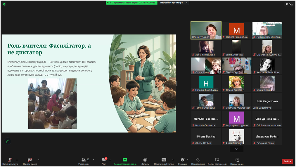Відповідно до плану роботи КУ «Одеський центр професійного розвитку педагогічних працівників» на 2026 рік 14 січня 2026 року о 13.00 на платформі Zoom відбувся вебінар для вчителів початкових класів «Діяльнісний підхід у початковій школі: від ідеї до практики».