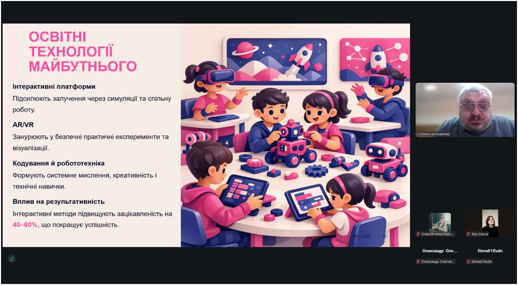 Спікери доступно і методично грамотно ознайомили учасників вебінару із сучасними освітніми технологіями, інноваційними цифровими інструментами та практичними засобами, які можна ефективно використовувати на уроках інформатики й робототехніки. На конкретних прикладах показали, як зробити навчальний процес більш цікавим, практикоорієнтованим та відповідним викликам часу.
