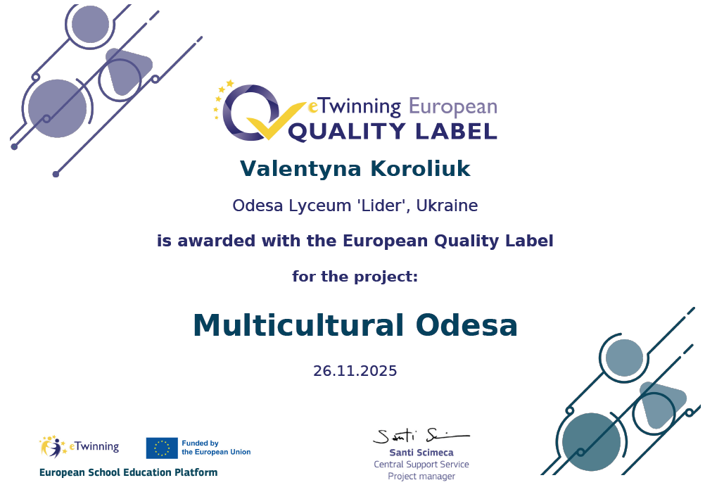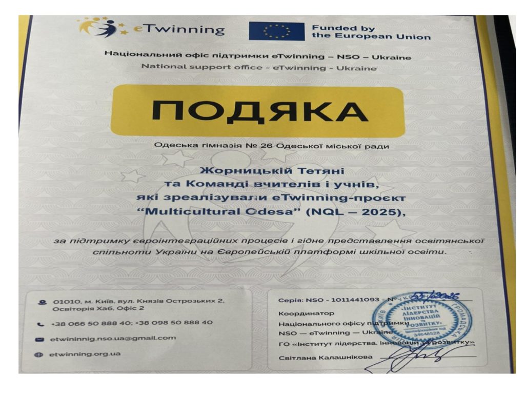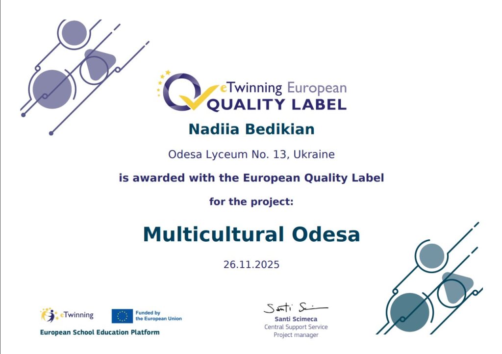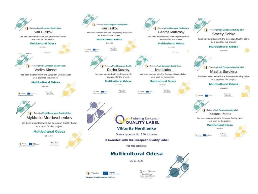 Приємно зазначити, що педагоги міста Одеси отримали подяки за реалізацію групового дослідницького проєкту «Мультикультурна Одеса» (засновниця – Вікторі Гордієнко, амбасадорка програми eTwinning), який був визначений одним із кращих у номінації «Навички для життя» за підсумками 2025 року. Попередньо за рішенням журі національного і європейського рівнів проєкт «Мультикультурна Одеса» отримав високу оцінку, а вчителі і діти нагороджені достойними відзнаками: Національною National Quality Label (NQL) і Європейською ( European Quality Label (EQL).