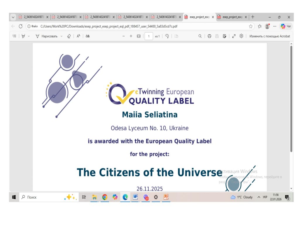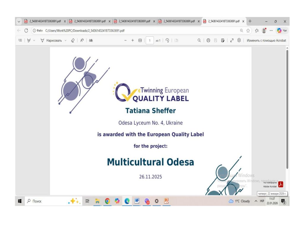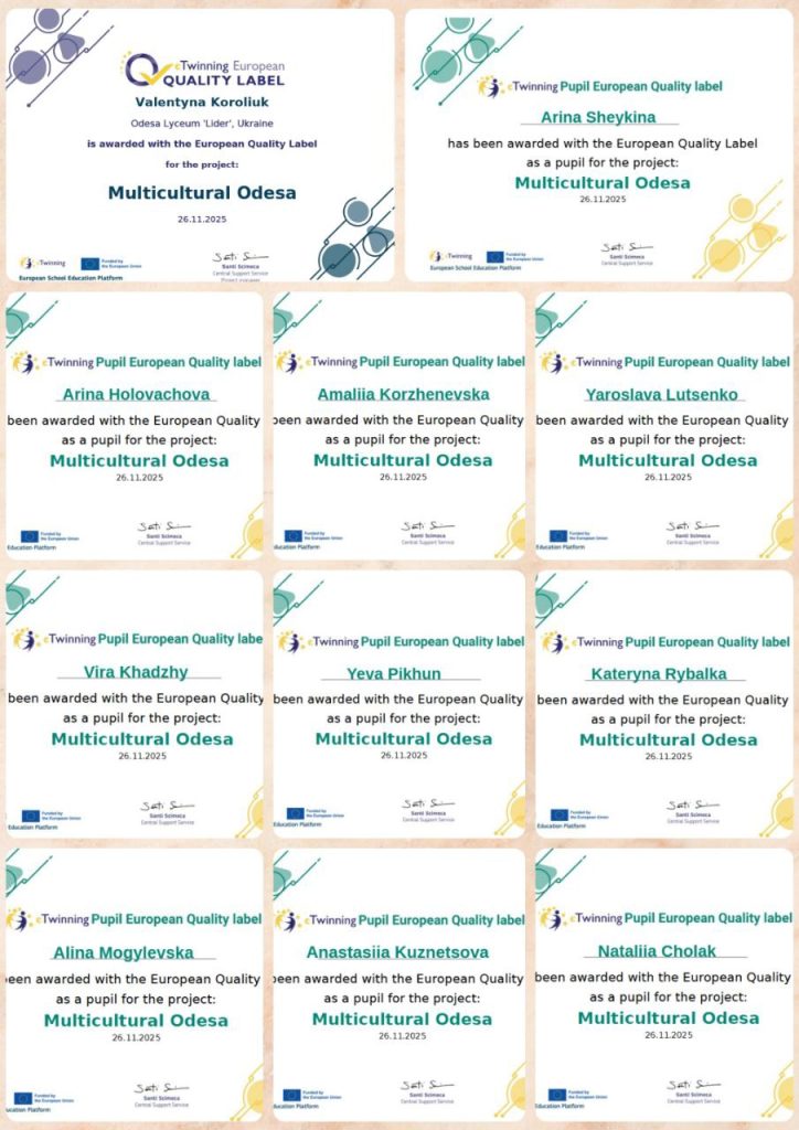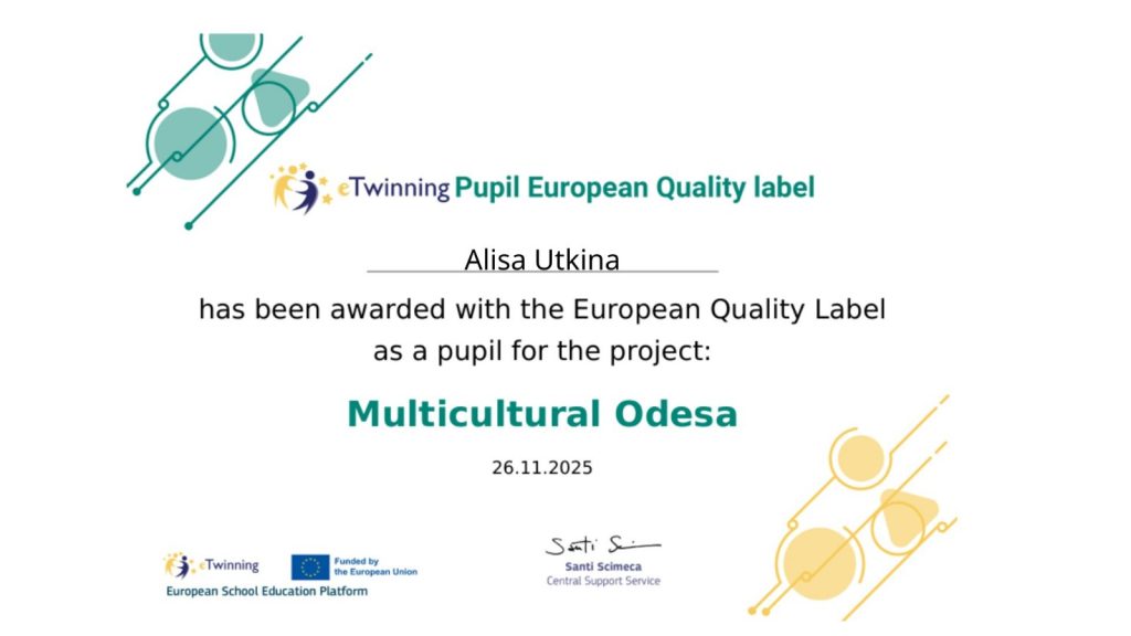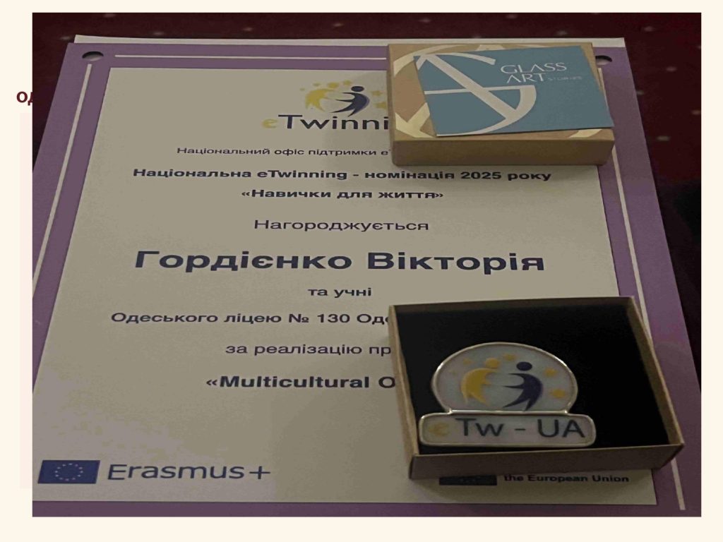 Приємно зазначити, що педагоги міста Одеси отримали подяки за реалізацію групового дослідницького проєкту «Мультикультурна Одеса» (засновниця – Вікторі Гордієнко, амбасадорка програми eTwinning), який був визначений одним із кращих у номінації «Навички для життя» за підсумками 2025 року. Попередньо за рішенням журі національного і європейського рівнів проєкт «Мультикультурна Одеса» отримав високу оцінку, а вчителі і діти нагороджені достойними відзнаками: Національною National Quality Label (NQL) і Європейською ( European Quality Label (EQL).
