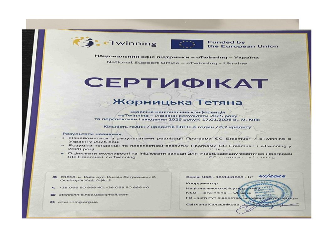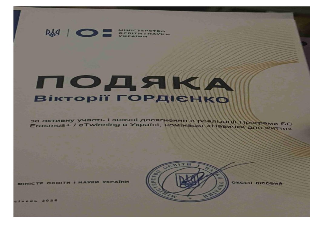 У рамках Міжнародного Програми eTwinning Ukraine 17 січня 2026 року в місті Києві відбулась щорічна національна конференція «eTwinning Ukraine: результати 2025 року та перспективи і завдання 2026 року». На заході відзначили учасників найкращих міжнародних проєктів у номінаціях: «Навички для життя», «Дебют», «Фронтир», «Малята-дошкільнята», «Вплив на громаду» та «Інновації в освіті».