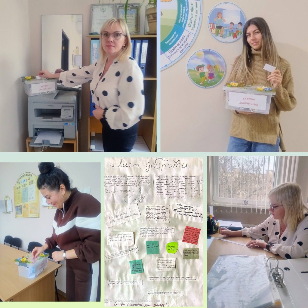 - Проведено класні години на тему «Техніки тілесної релаксації для зняття стресу»; ігри на комунікацію «Загублені в Гімалаях», «Вчимося дружити». Класні керівники організували конкурс аплікацій «Хмарка настрою» та інформаційно-практичне заняття «Гармонійний розвиток півкуль головного мозку».