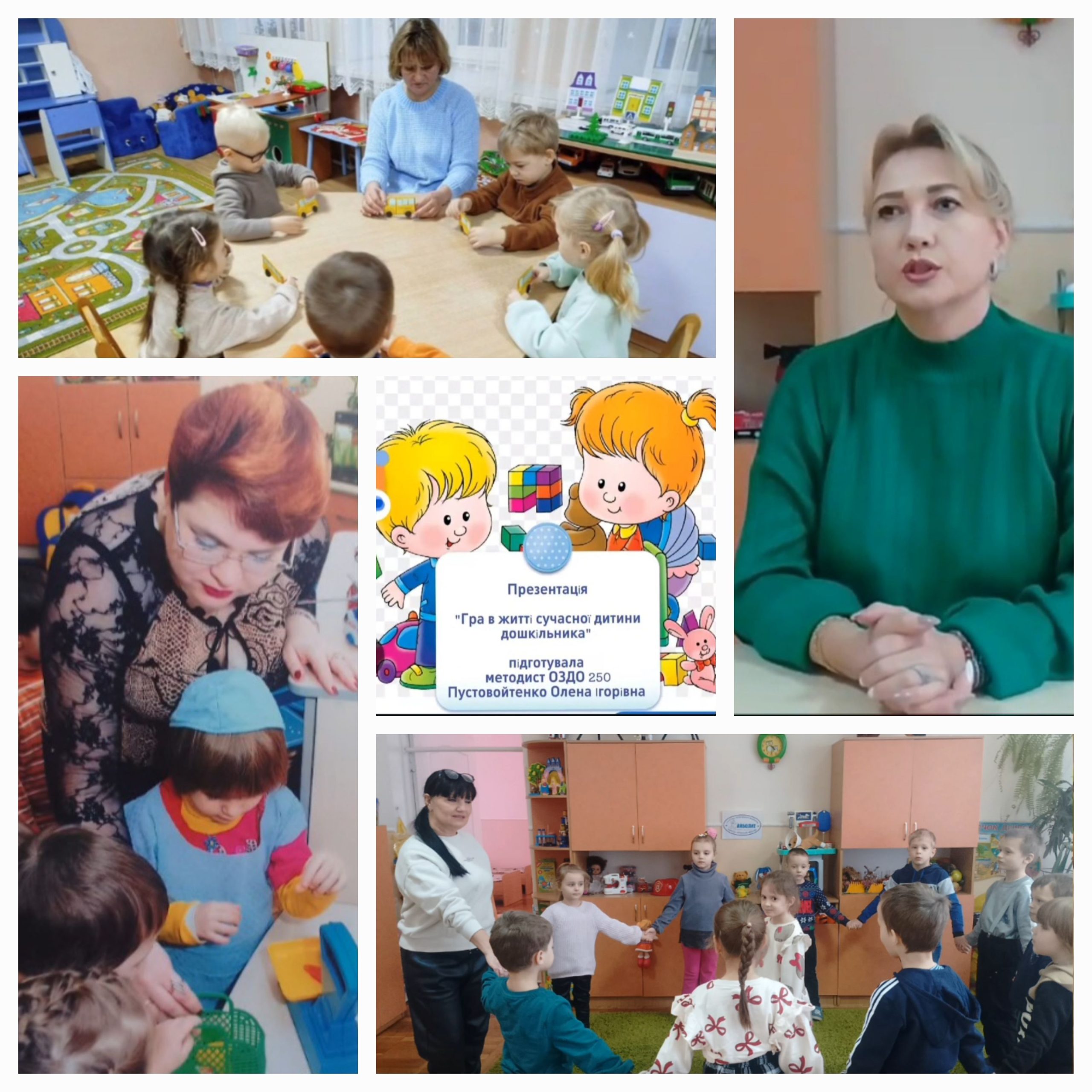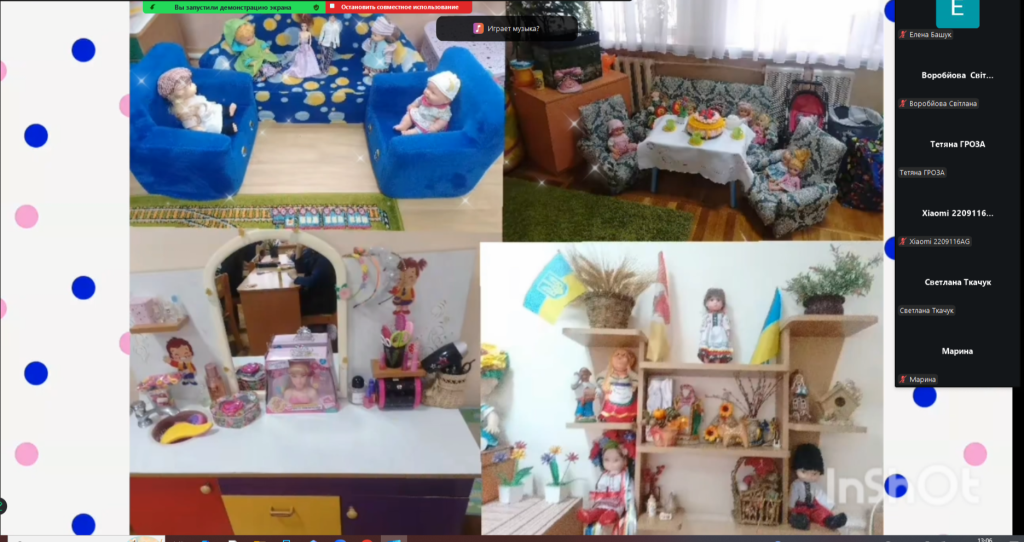 Далі майстерку продовжили педагоги ясла-садка № 250. Вихователь-методист Олена Пустовойтенко ознайомила колег з роботою свого закладу, презентувала ігрові куточки та зони розвитку. Вихователі Юлія Ятманкина, Ірина Барсукова та Людмила Юрко поділилися своїм досвідом роботи та надали методичні поради, рекомендації щодо керівництва дитячою грою, створення якісних умов для ігрового середовища, розповіли про види ігрової діяльності, про те, які здібності формуються під час гри та якими навичками дитина оволодіває. Розповіді педагогів супроводжувалися світлинами та відео, що демонстрували, як вони використовують на практиці презентовані технології та методи роботи.