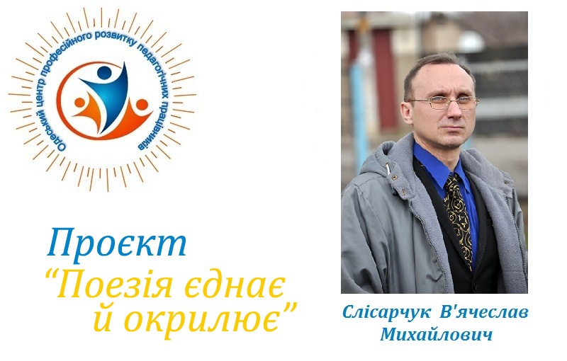 Слісарчук В’ячеслав Михайлович – одеський письменник, краєзнавець, журналіст, працює завідувачем бібліотекою КОМУНАЛЬНОГО ЗАКЛАДУ ПОЗАШКІЛЬНОЇ ОСВІТИ «ОДЕСЬКИЙ МІСЬКИЙ ПАЛАЦ ДИТЯЧОЇ ТА ЮНАЦЬКОЇ ТВОРЧОСТІ», член ініціативної творчої групи вчителів-шанувальників поетичного слова та створення проєкту «Поезія єднає».