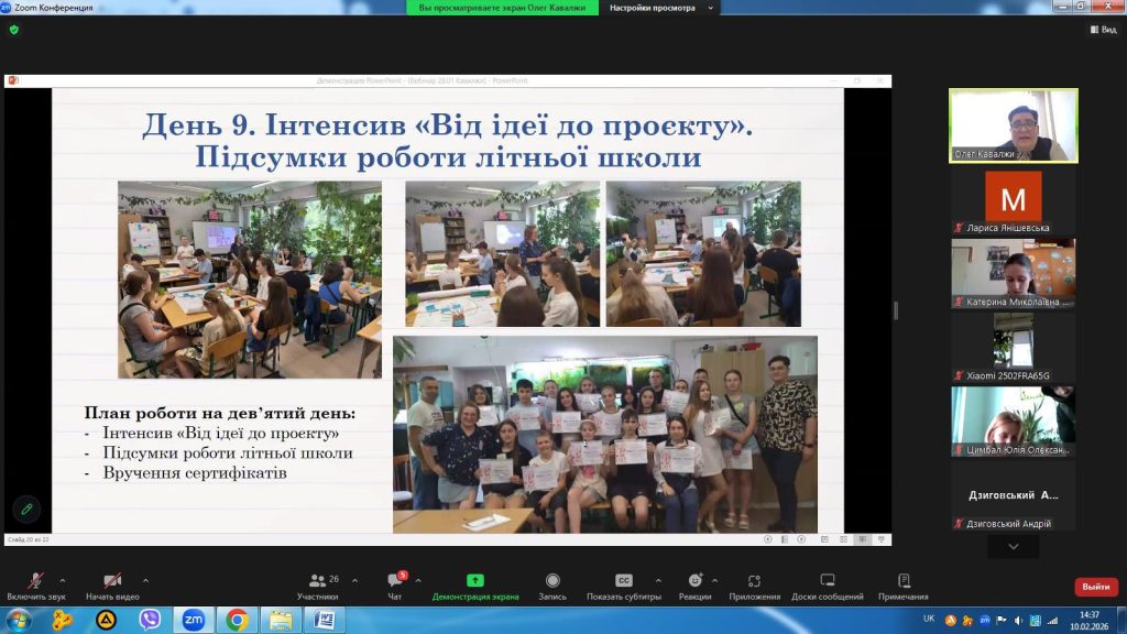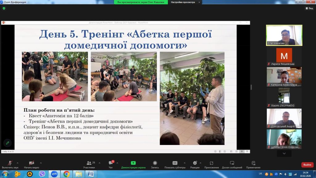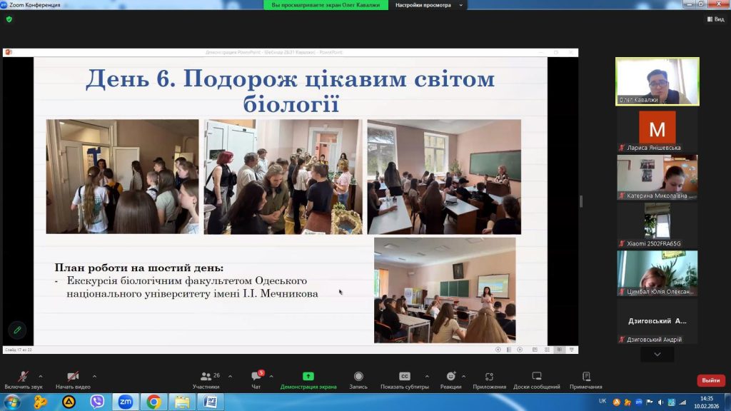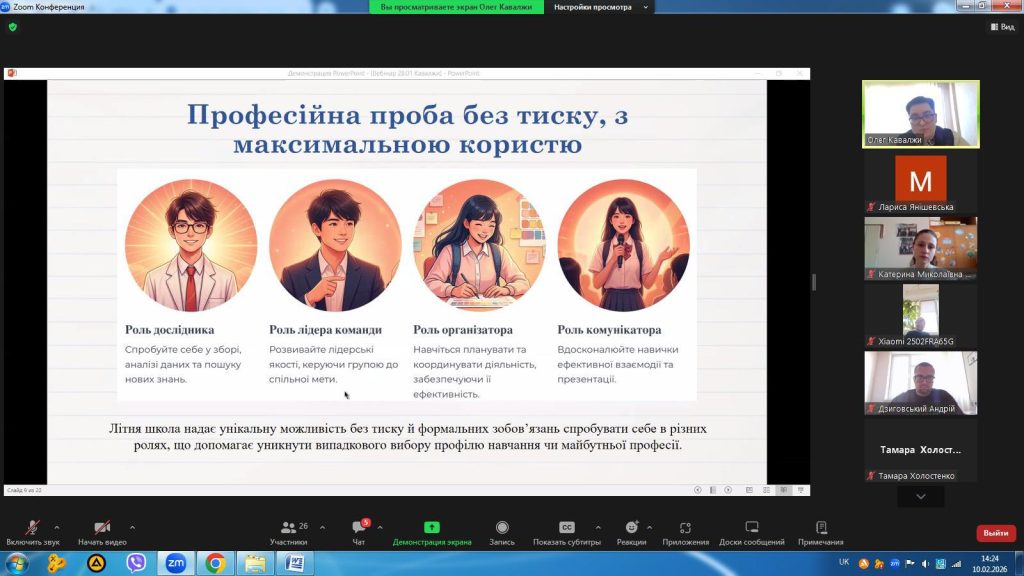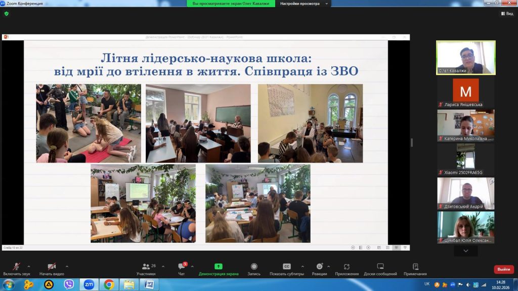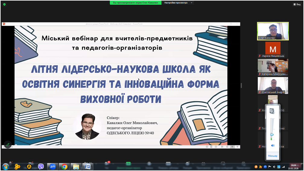10 лютого 2026 року відповідно до плану роботи КУ «Одеський центр професійного розвитку педагогічних працівників» на 2026 рік на платформі Zoom відбувся вебінар для вчителів-предметників та педагогів-організаторів на тему «Літня лідерсько-наукова школа як освітня синергія та інноваційна форма виховної роботи».