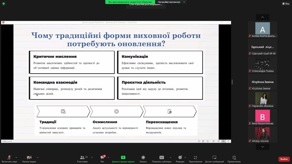 Спікером вебінару виступив Олег Кавалжи, педагог-організатор Одеського ліцею №40, який акцентував увагу на зміні ролі педагога з інформатора на наставника і фасилітатора, важливості створення умов для самореалізації, відповідальності та ініціативності учнів, а також на ефективному поєднанні проєктної, дослідницької та командної роботи.
