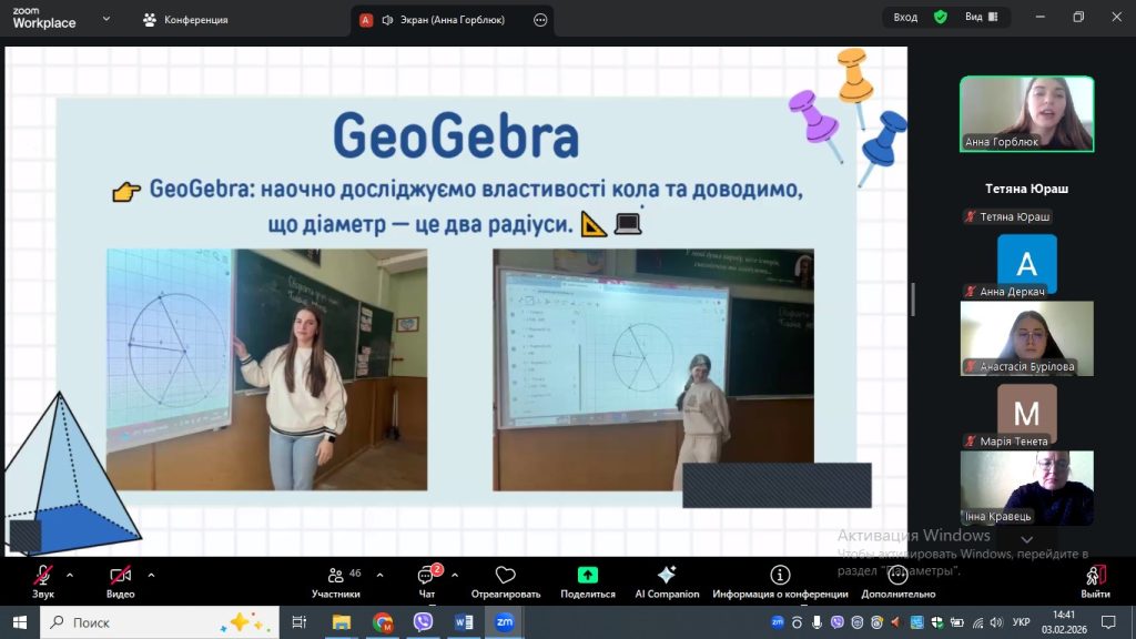 - GeoGebra: Була представлена як незамінний інструмент для динамічної візуалізації геометричних побудов та дослідження функцій. Учні не просто бачать статичний малюнок, а можуть самостійно змінювати параметри фігур, миттєво спостерігаючи за зміною властивостей та обчислень.