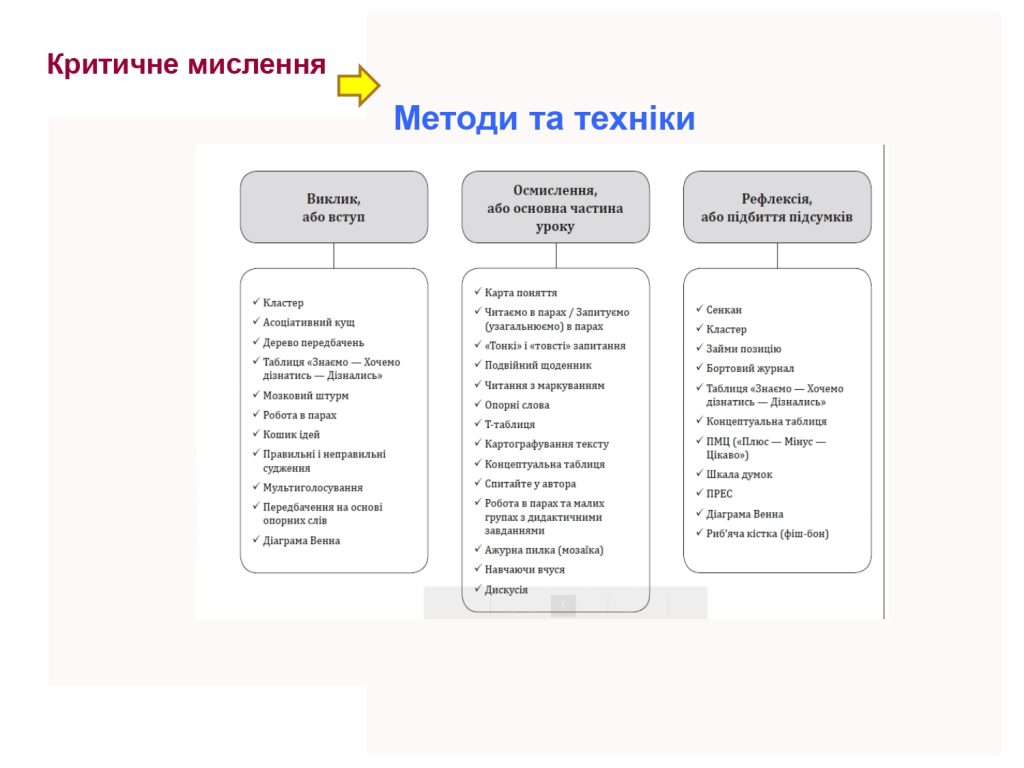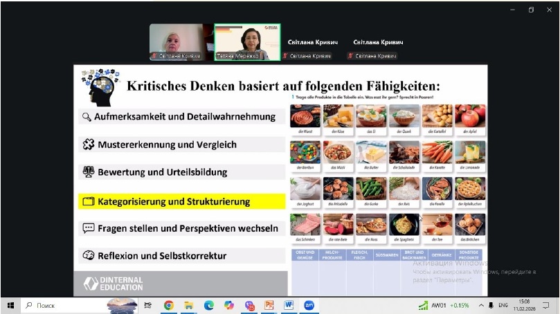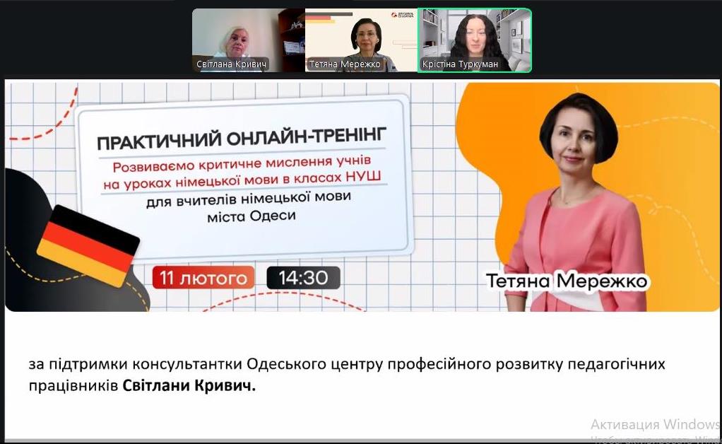На початку заходу було актуалізовано знання педагогів щодо технології критичного мислення: окреслено методи, прийоми та техніки, які можна використовувати на різних етапах сучасного уроку для формування критичного і системного мислення. Наголошено, що її застосування на уроках німецької мови допомагає розвивати в здобувачів освіти важливі для життя якості, а саме: вміння орієнтуватись у сучасному інформаційному просторі, аналізувати проблемні ситуації, зіставляти і порівнювати факти, дискутувати та обґрунтовувати власну позицію тощо. (Світлана Кривич, консультантка Комунальної установи «Одеський центр професійного розвитку педагогічних працівників»).