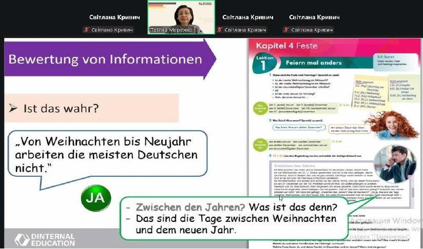 Власною методикою з формування критичного мислення на уроках німецької мови поділилась Тетяна Мережко, методистка Міжнародного освітньо-методичного центру Dinternal Education, співавторка курсу PERFEKT FÜR DIE UKRAINE. Спікерка окреслила важливі аспекти, на яких базується вищезазначена методика: увага та сприйняття деталей, категоризація і структуризація, вміння ставити запитання й змінювати перспективу, рефлексувати та самостійно коректувати власні результати. Під її керівництвом педагоги опанували сучасні стратегії, методики та алгоритм дій з формування критичного мислення на уроках німецької мови, а саме: методи аргументації (дискусія, дебати, батл, есей), аналізу або оцінки інформації («це правда?», три джерела інформації – веб-сайти, відео, демонстрації; «правило чи виключення» тощо), припущення (креативне прогнозування, стоп-кадр, активізація знань з граматики тощо).