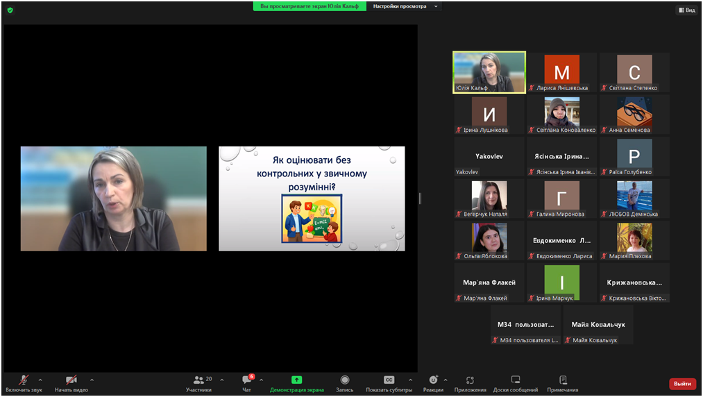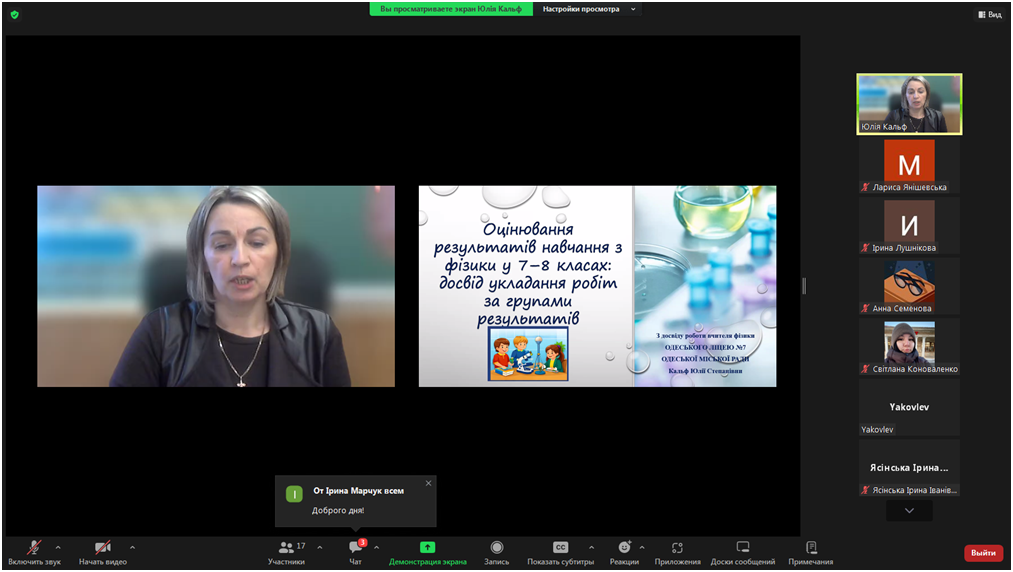 Спікер заходу – Кальф Ю.С., вчитель фізики Одеського ліцею №7 Одеської міської ради презентувала досвід оцінювання результатів навчання учнів 7 – 8 класів з фізики відповідно до вимог НУШ.