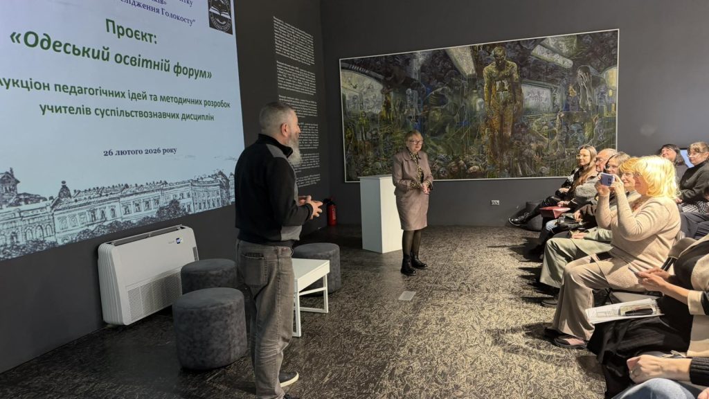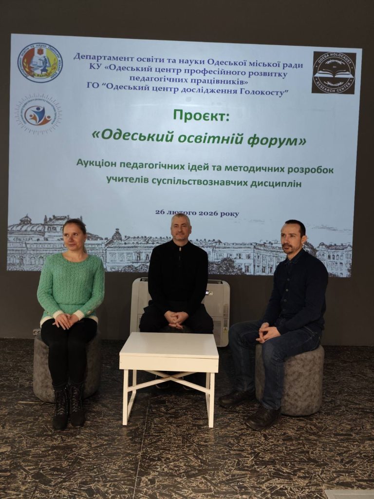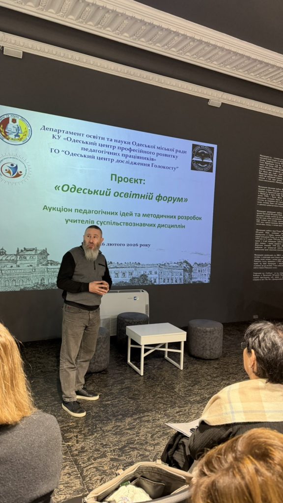 27 лютого 2026 року в Музеї геноциду “Територія пам’яті», в рамках проєкту “Одеський освітній форум», ініційованого КУ “ОЦПРПП” та ГО “Одеський центр дослідження Голокосту», відбувся аукціон педагогічних ідей вчителів громадянської та історичної галузі закладів освіти міста. Учасників освітнього заходу привітав голова правління Одеського центру дослідження Голокосту, кандидат філософських наук Павло Козленко.
