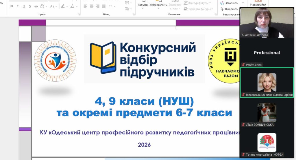 04 березня 2026 року Комунальною установою «Одеський центр професійного розвитку педагогічних працівників» було проведено вебінар «Конкурсний відбір підручників – 2026» для заступників директорів, які відповідають за замовлення підручників та бібліотечних працівників закладів загальної середньої освіти міста Одеси, присвячений процедурі конкурсного відбору підручників відповідно до офіційних рекомендацій та роз’яснень Міністерства освіти і науки України (лист № 1/3208-26 від 18.02.2026 року).