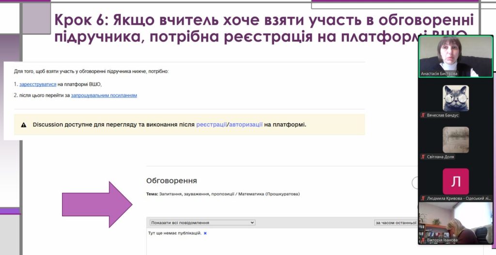 Захід відбувся за участі консультанта Бистрової Анастасії, яка детально ознайомила педагогічних працівників із ключовими положеннями листа МОН України щодо організації та проведення конкурсу підручників для закладів загальної середньої освіти. Учасникам було представлено покроковий алгоритм дій закладів освіти, починаючи від реєстрації на платформі Конкурсного відбору й завершуючи формуванням та поданням спеціальної форми вибору підручників.
