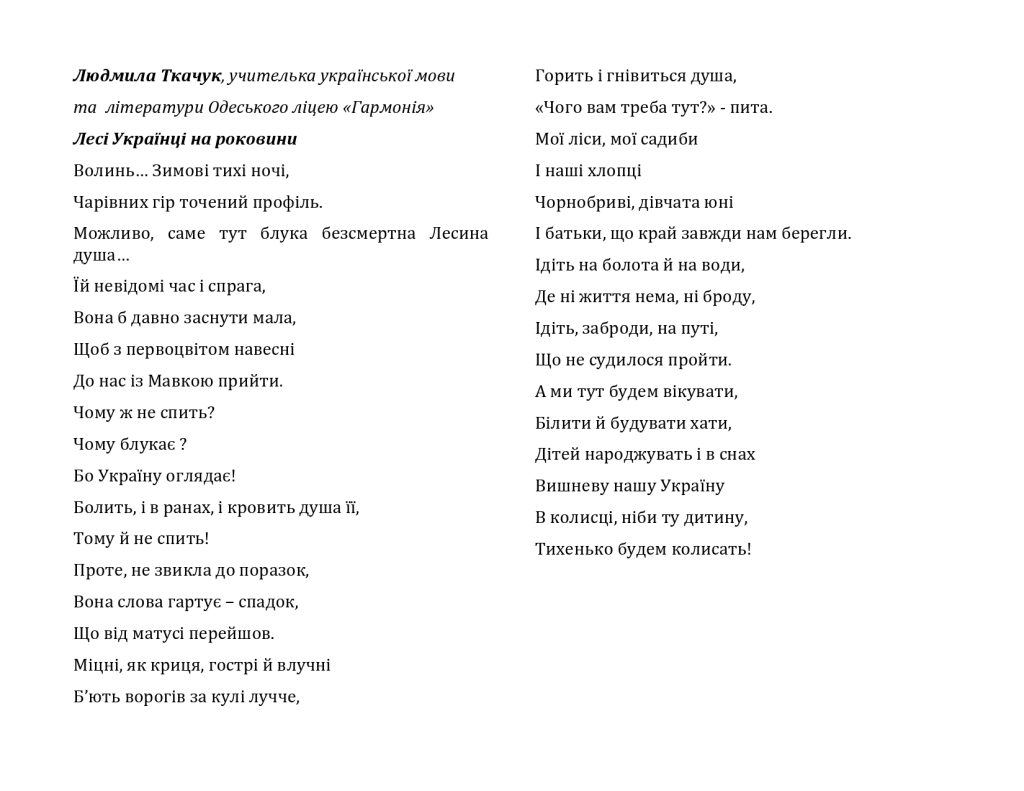 «Щоб не плакать, я сміялась…», – таким було кредо її життя. Символ нації, Дочка Прометея, Ломикамінь, Співачка досвітніх вогнів…Так називали й називаємо ми нашу Лесю, ніжну, тендітну, хвору дівчину, але водночас сильну, мужню й незламну.