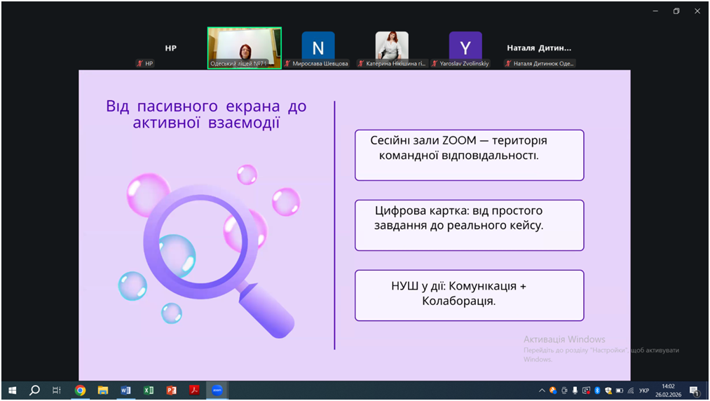 Учасники вебінару дійшли висновку, що успішний сучасний урок — це баланс між технічними можливостями платформ та чітко спланованою взаємодією учнів. Потрібно перебувати в гармонії з вимогами часу та постійно вдосконалювати свій професійний кейс.