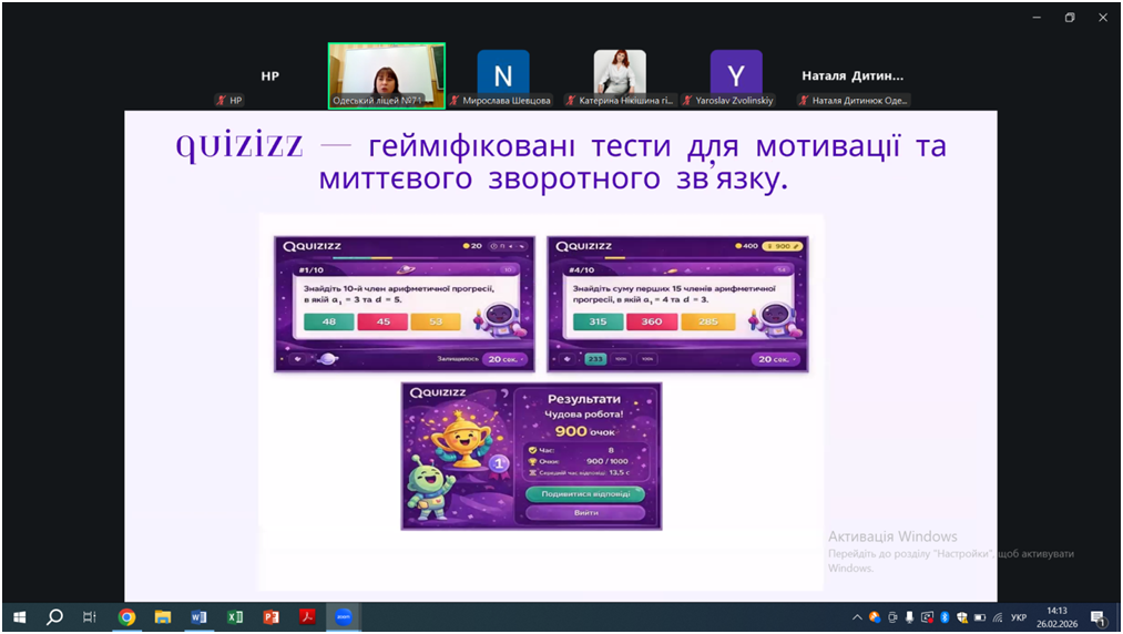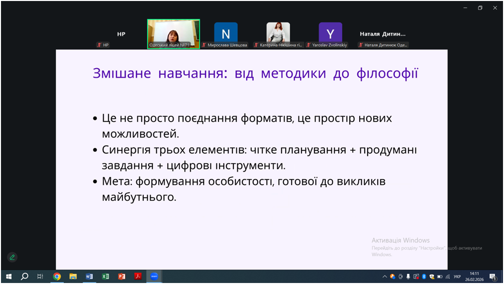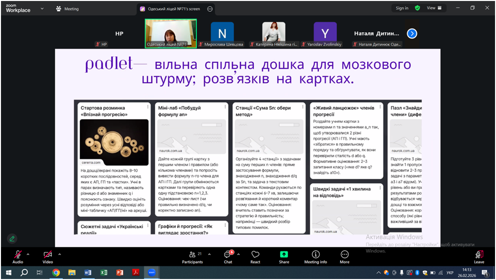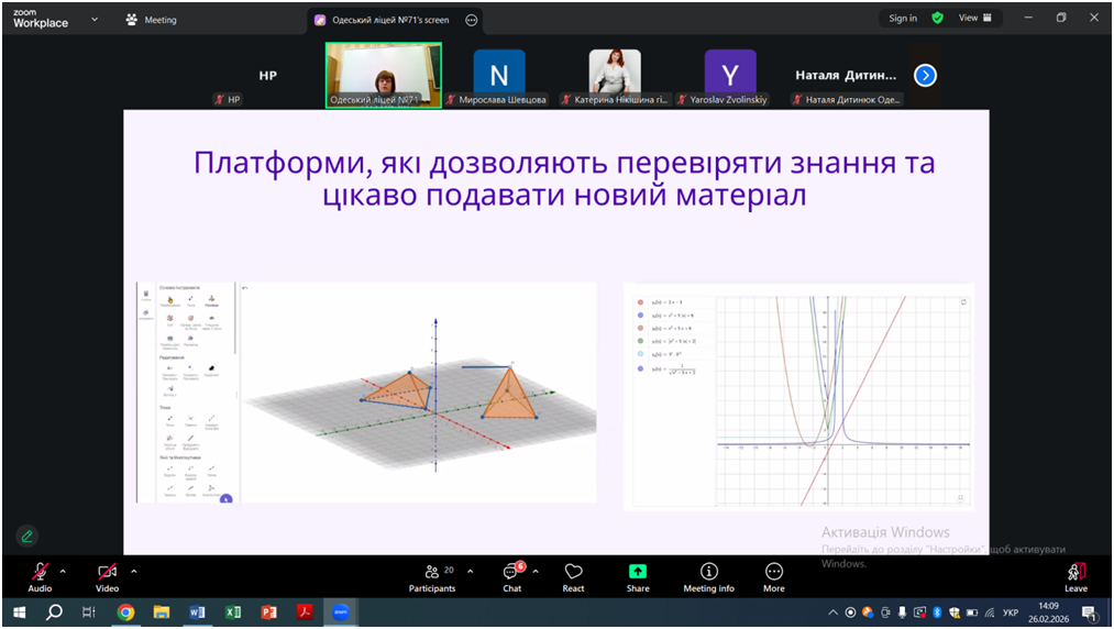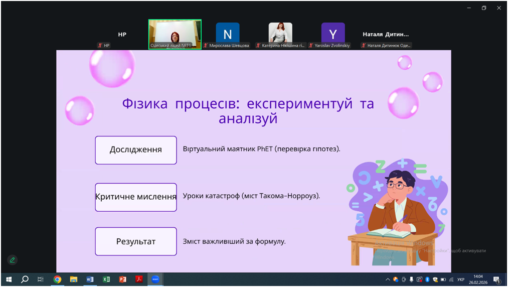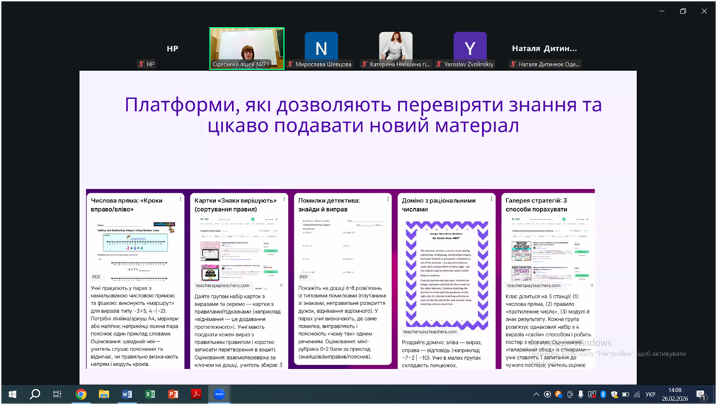 Відповідно до плану роботи КУ «Одеський центр професійного розвитку педагогічних працівників» на 2026 рік 26 лютого відбувся вебінар «Особливості проведення уроків під час змішаного навчання, практичні поради щодо організації групової та парної взаємодії на уроках. Онлайн-сервіси на уроках математики, фізики, інформатики», в якому взяли участь вчителі математики, фізики та інформатики міста Одеси.