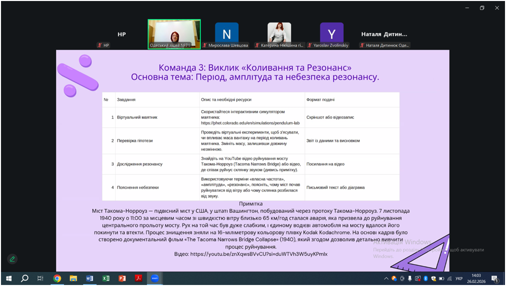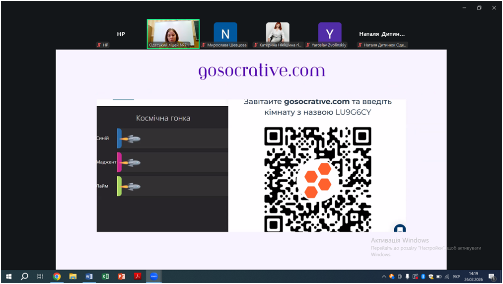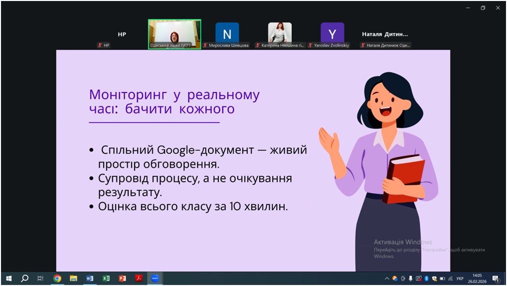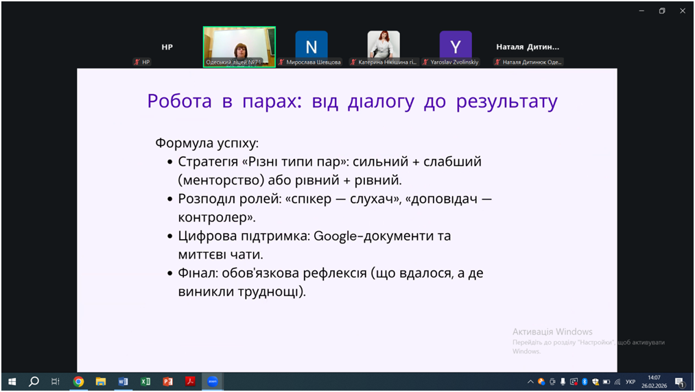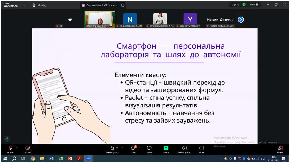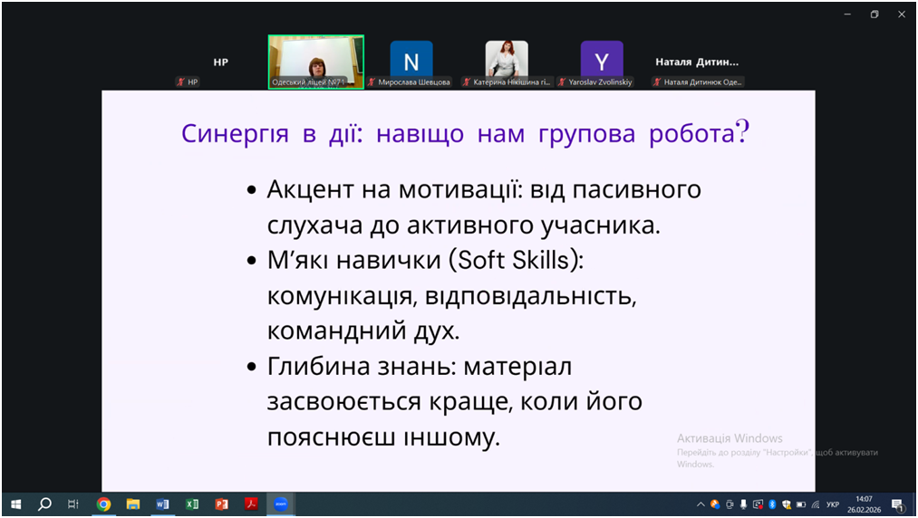 Відповідно до плану роботи КУ «Одеський центр професійного розвитку педагогічних працівників» на 2026 рік 26 лютого відбувся вебінар «Особливості проведення уроків під час змішаного навчання, практичні поради щодо організації групової та парної взаємодії на уроках. Онлайн-сервіси на уроках математики, фізики, інформатики», в якому взяли участь вчителі математики, фізики та інформатики міста Одеси.
