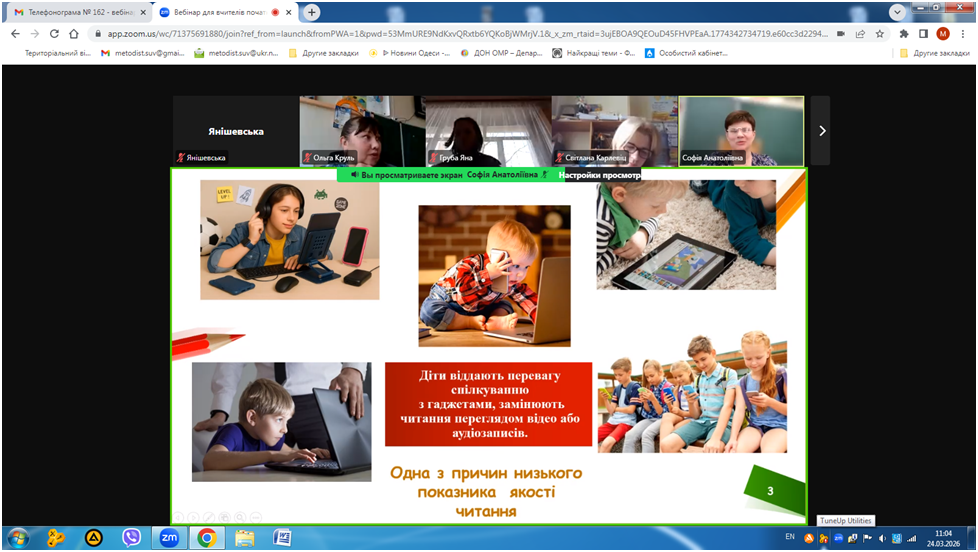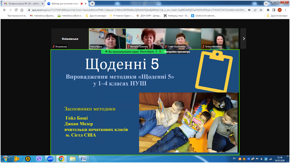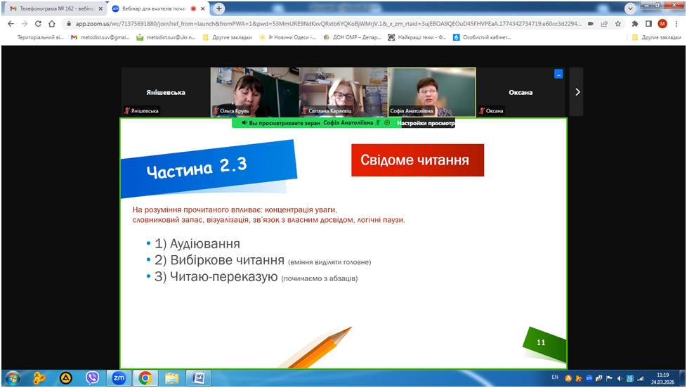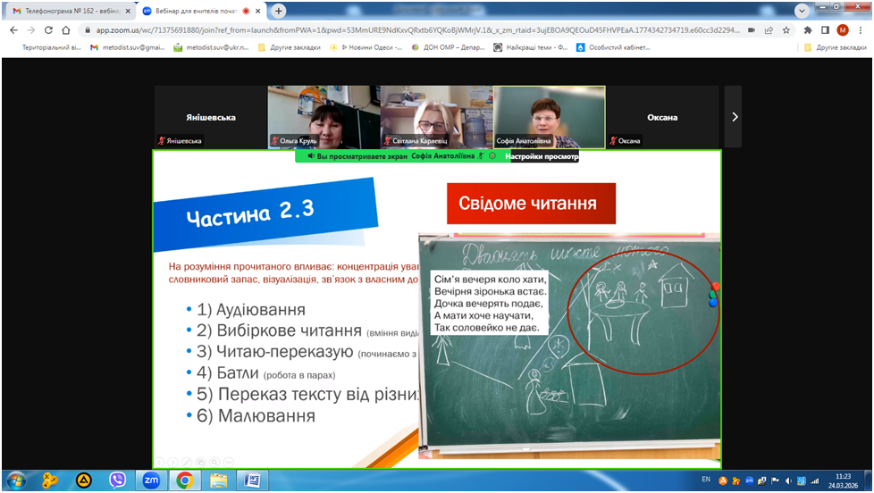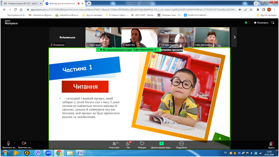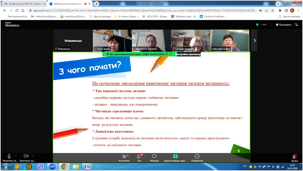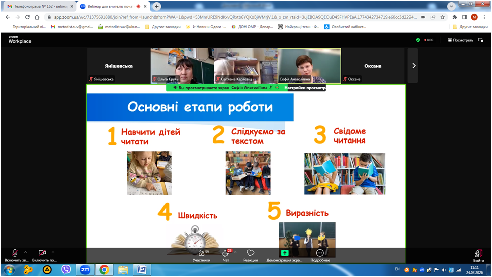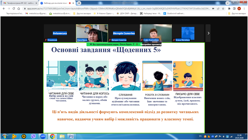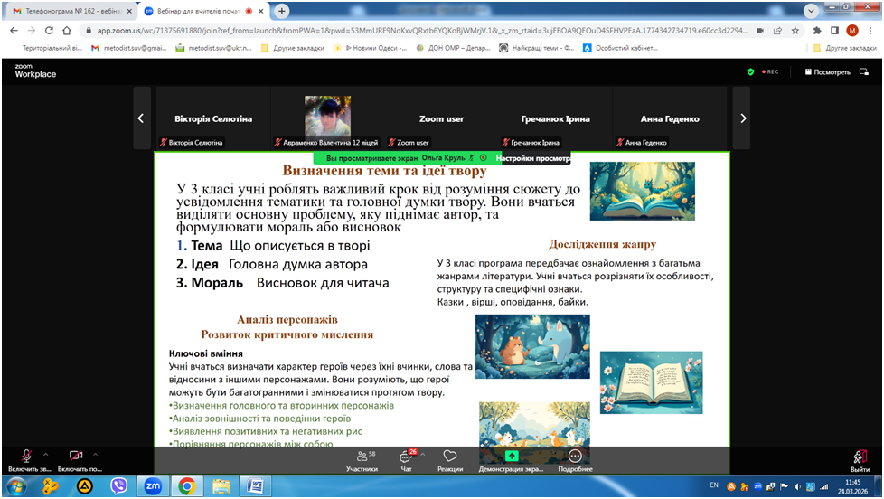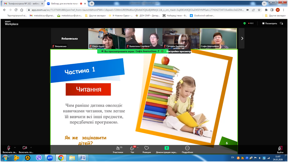 24 березня 2026 року відбувся вебінар «Кейс вчителя початкових класів для формування позитивної мотивації до читання», в якому взяли участь вчителі початкової школи закладів освіти міста Одеса.