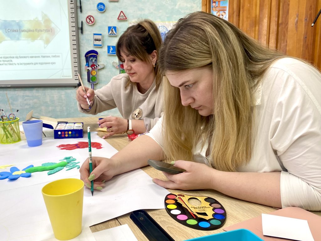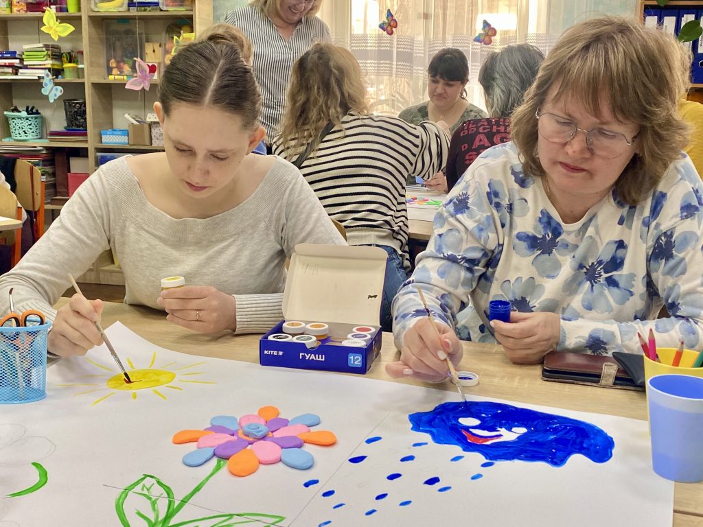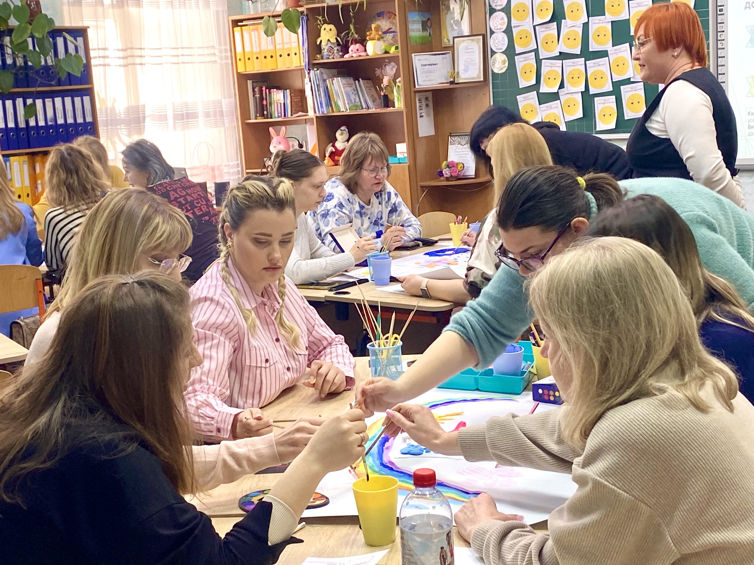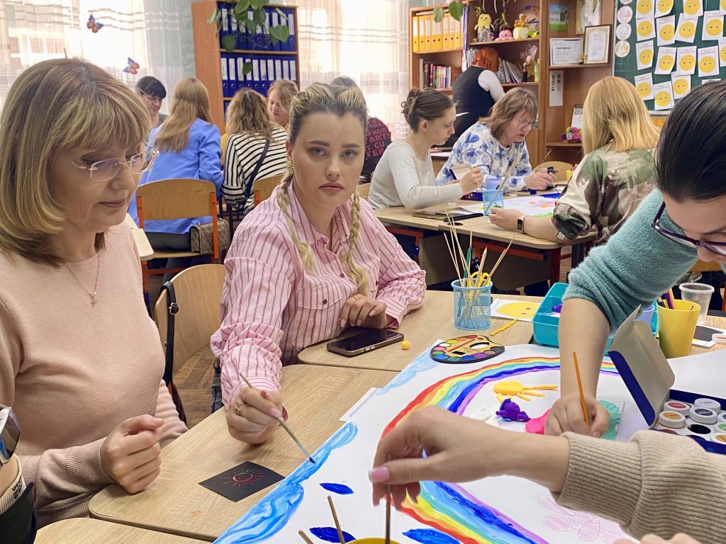 Присутні вчителі із захопленням працювали з пластиліном, фарбами, олівцями. Поділені на групи, вони створювали свої власні яскраві казки, які презентували колегам. Релаксуюча тиха музика додавала нотки спокою, затишку, захищеності.
