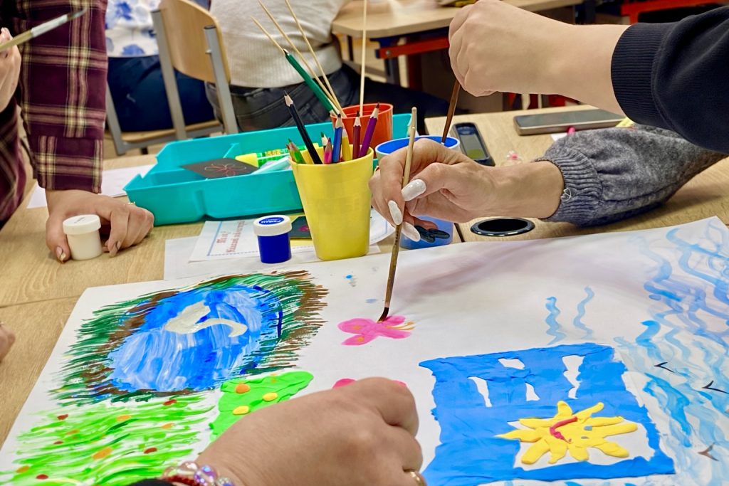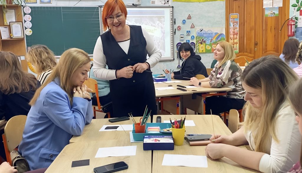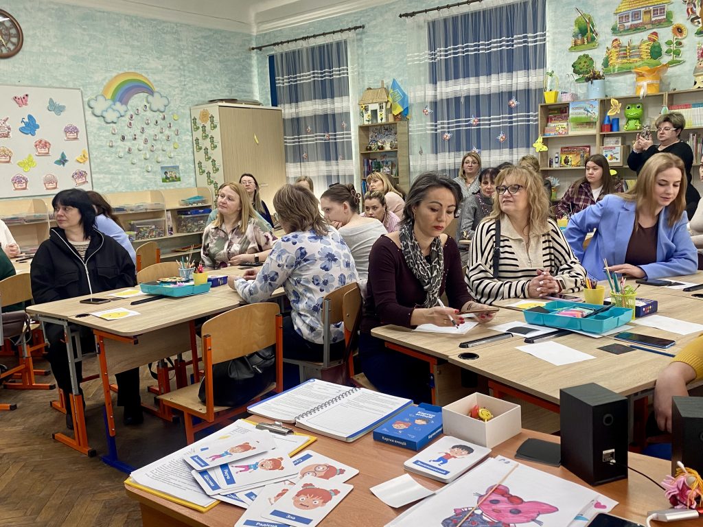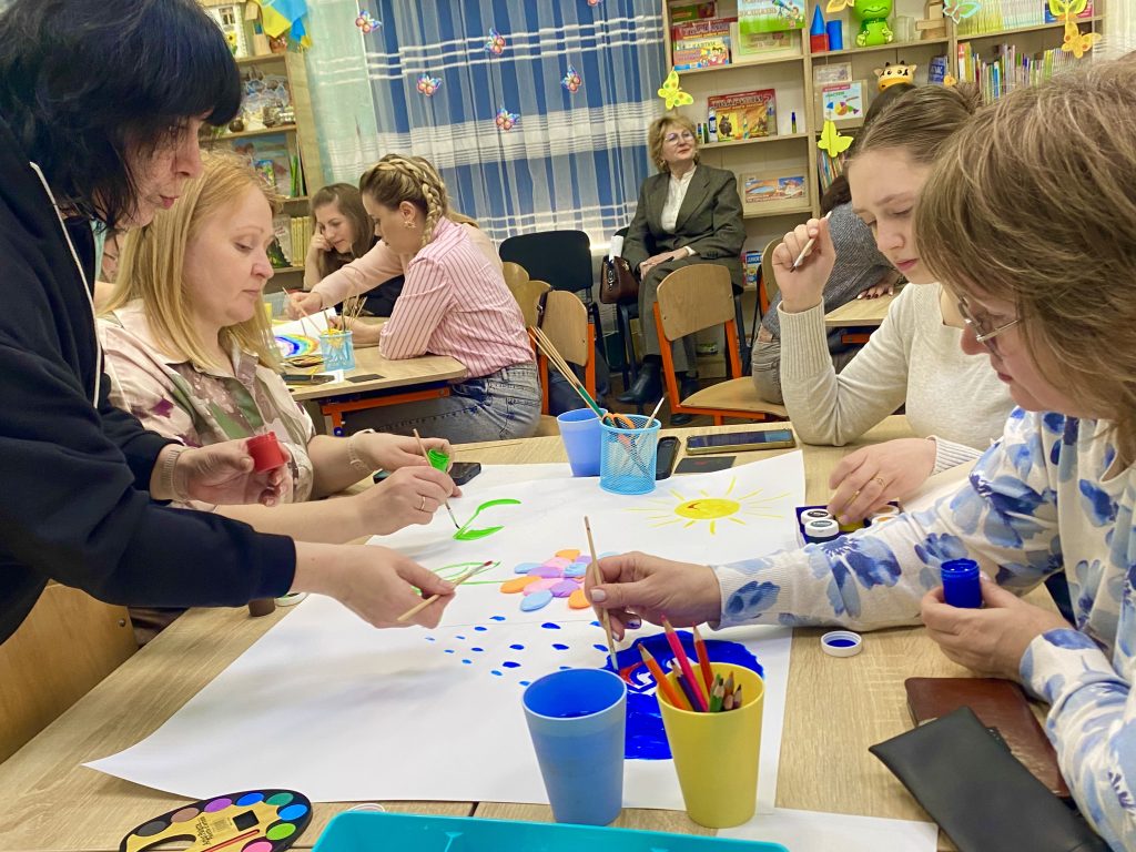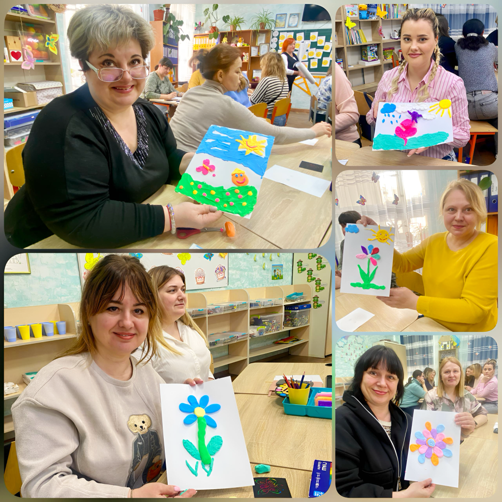 Присутні вчителі із захопленням працювали з пластиліном, фарбами, олівцями. Поділені на групи, вони створювали свої власні яскраві казки, які презентували колегам. Релаксуюча тиха музика додавала нотки спокою, затишку, захищеності.