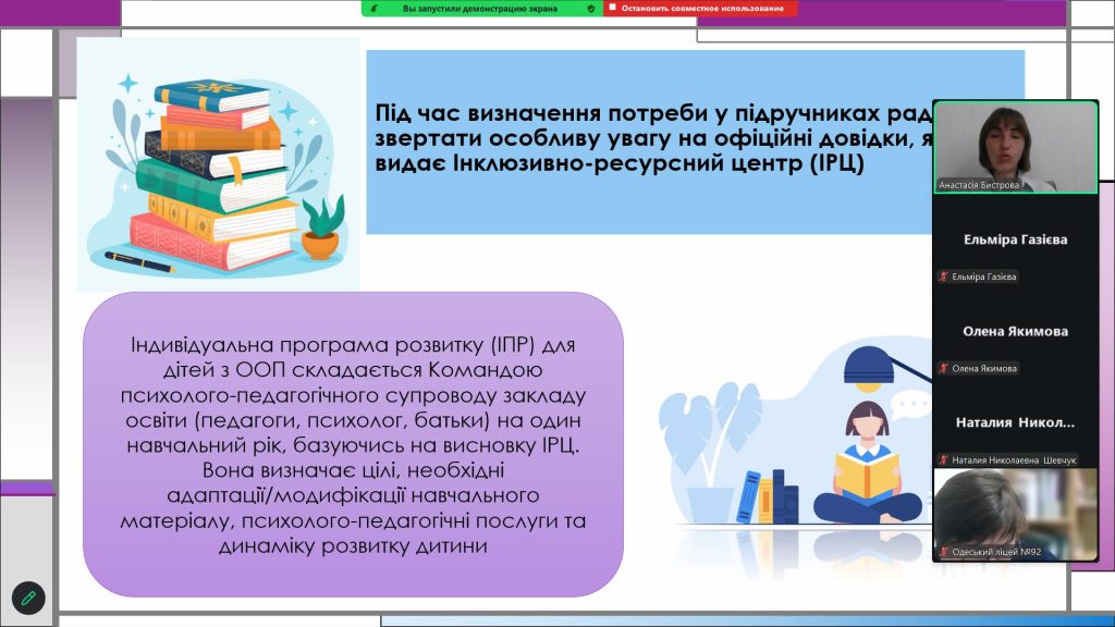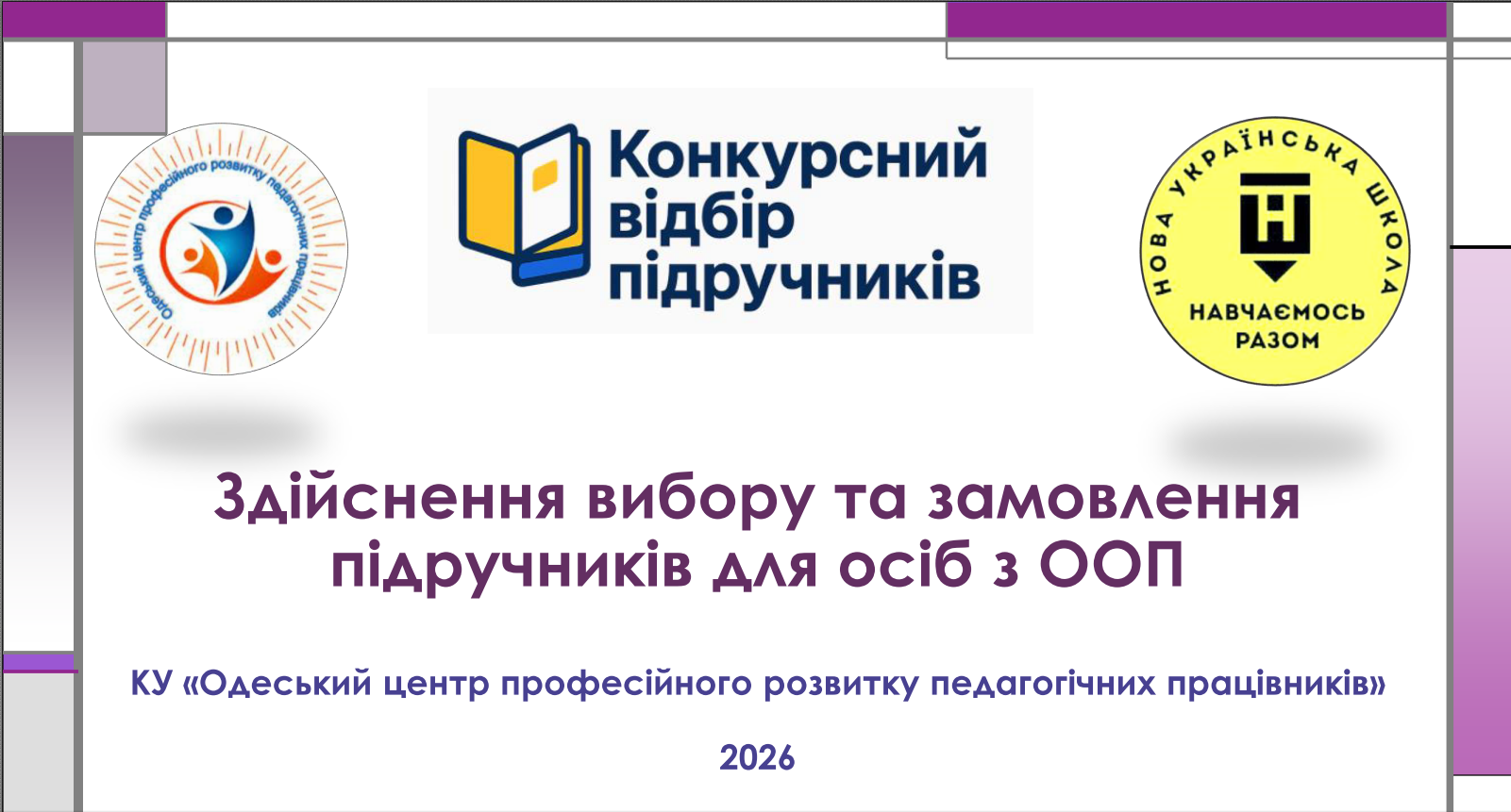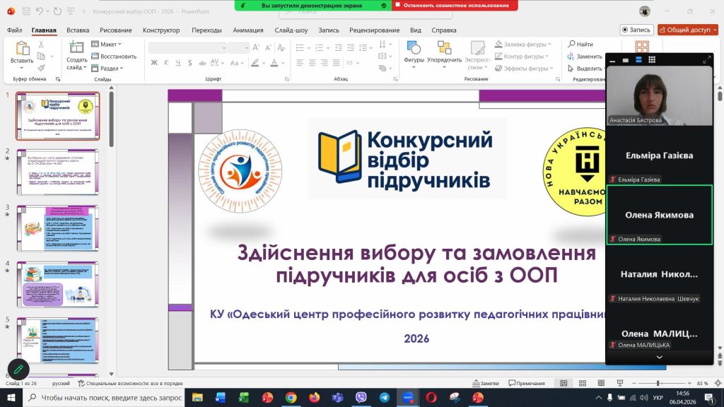 06 квітня 2026 року консультантом Комунальної установи «Одеський центр професійного розвитку педагогічних працівників» Бистровою Анастасією було проведено навчальний вебінар на тему «Здійснення вибору та замовлення підручників для осіб з особливими освітніми потребами (ООП) – 2026» на платформі Zoom. Захід був призначений для закладів загальної середньої освіти міста Одеси, у яких є інклюзивні класи та спеціальних закладів освіти. Метою заходу було підвищення професійної компетентності педагогічних працівників та забезпечення якісного й своєчасного вибору навчальної літератури для здобувачів освіти з особливими освітніми потребами.