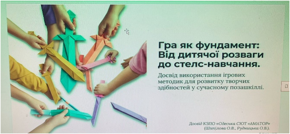 У роботі вебінару взяли участь педагоги закладів позашкільної та загальної середньої освіти, які долучилися до обговорення інноваційних підходів у роботі з вихованцями віком 7-12 років. Спікери заходу — директор КЗПО «Одеська СЮТ «Аматор» Олена Шипілова та керівник гуртка «Паперопластика» Олена Рудницька представили авторський досвід трансформації дитячої розваги у серйозний освітній результат.