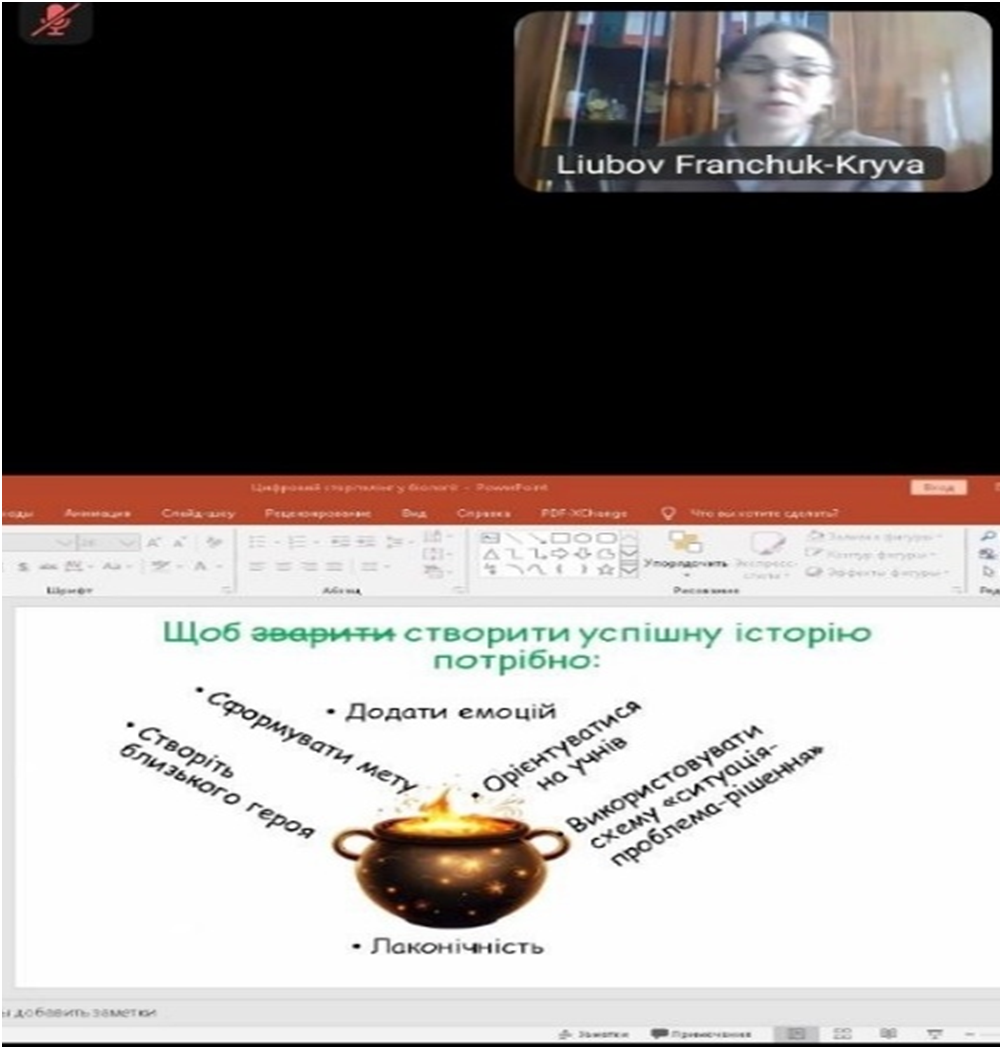 Теоретична частина була підкріплена демонстрацією прикладів створення освітніх історій, що допомогло учасникам глибше осягнути алгоритми впровадження сторітелінгу в освітній процес.